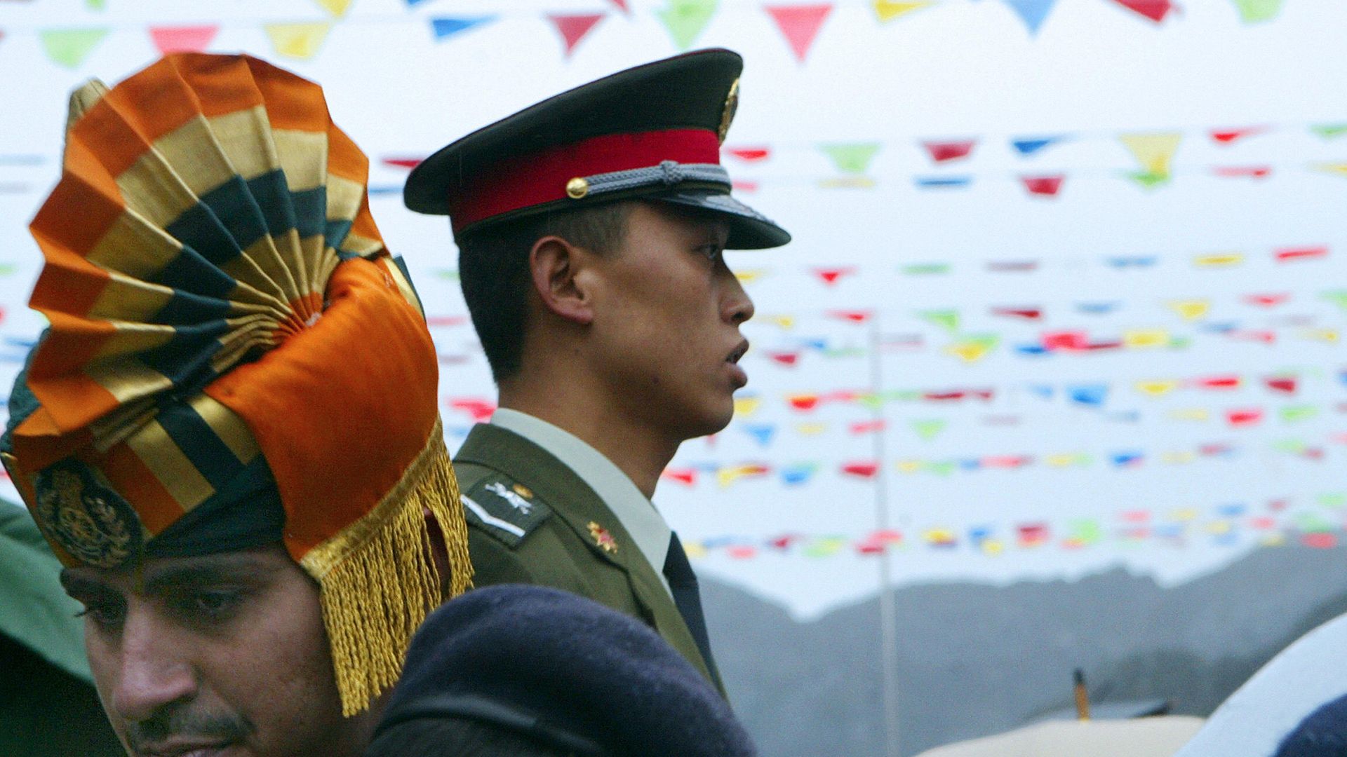 A Chinese and an Indian soldier during a ceremony in 2006. Photo: Deshakalyan Chowdhury/AFP via Getty Images