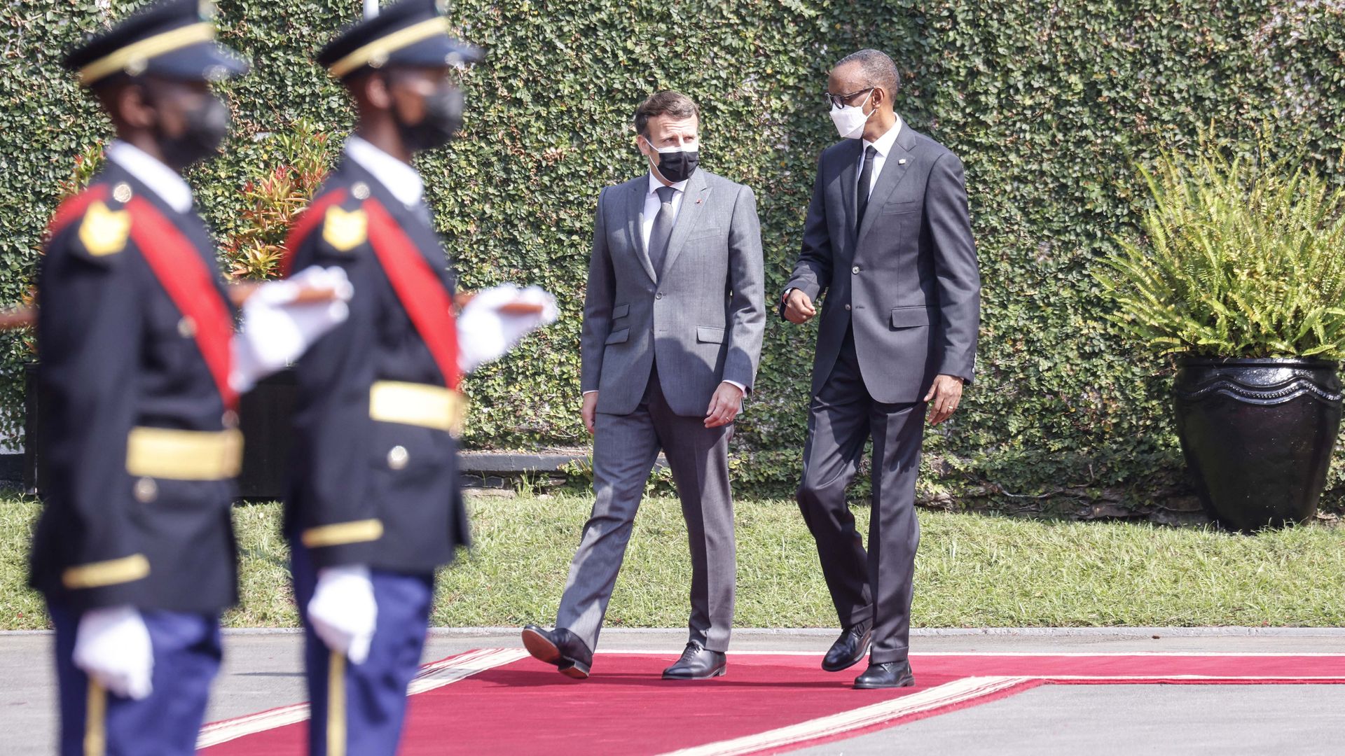 Kagame (R) with Macron on Thursday in Kigali, Rwanda. Photo: Ludovic Marin/AFP via Getty