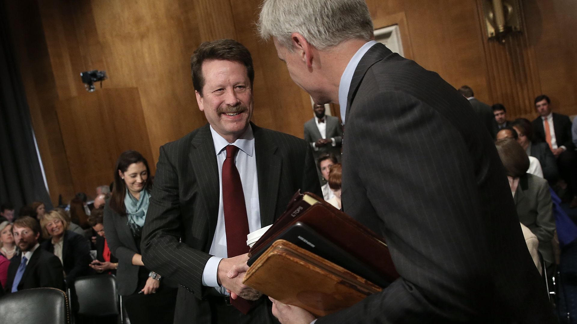 Robert Califf shakes hands with Sen. Bill Cassidy (R-La.) before his nomination hearing before the Senate Health, Education, Labor and Pensions Committee in 2015. Photo: Win McNamee/Getty Images