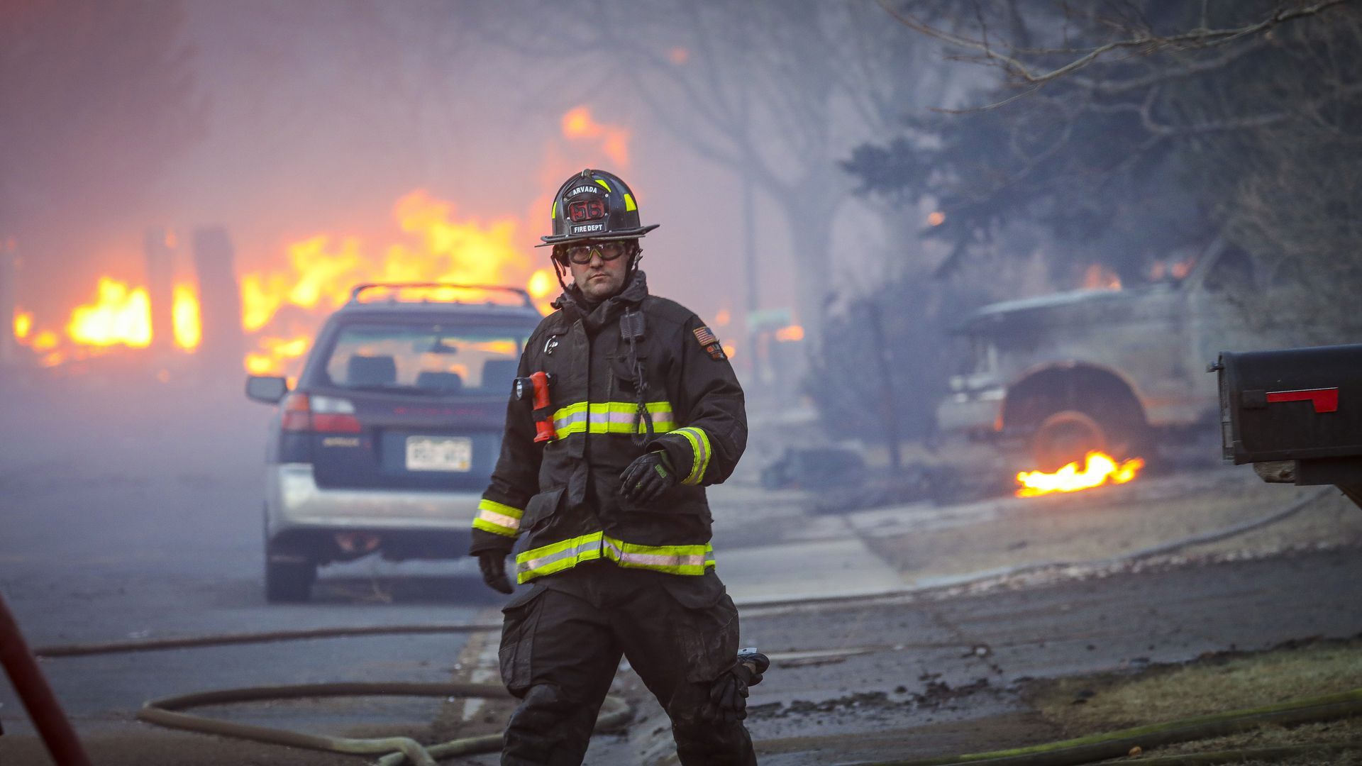 An Arvada firefighter walks back to the firetruck as a fast moving wildfire swept through a Louisville neighborhood, destroying cars and homes. Photo: Marc Piscotty/Getty Images