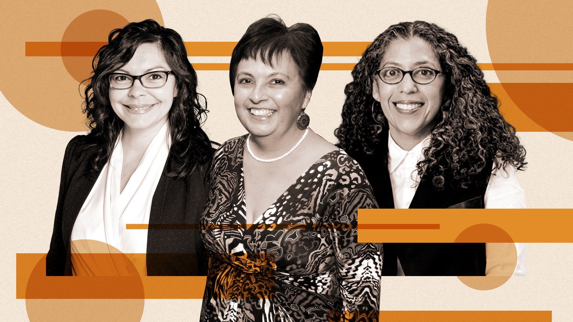 From left, Latina curators Margaret Salazar-Porzio, Elizabeth Ferrer and E. Carmen Ramos. Photo Illustration: Shoshana Gordon/Axios. Photos: Smithsonian, National Gallery of Art, Neilson Barnard/Getty Images