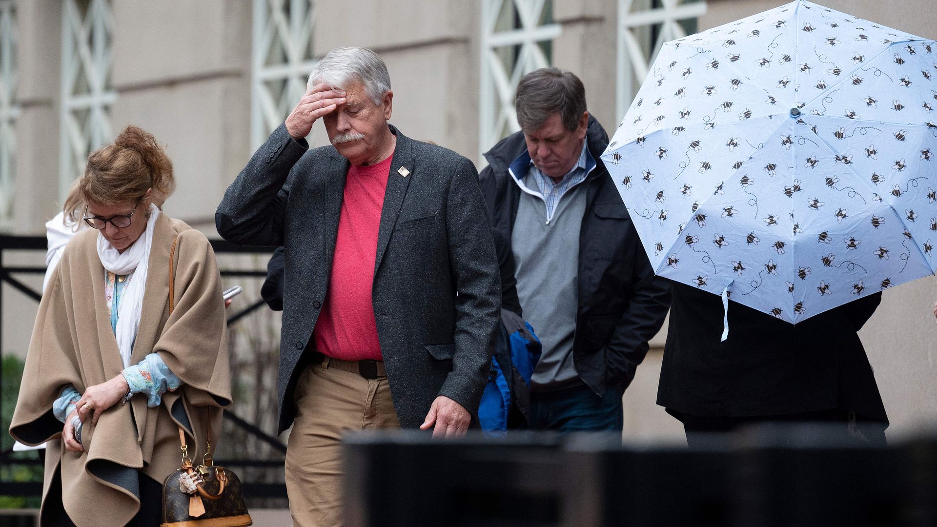 Carl Mueller (center), the father of hostage Kayla Mueller, who was slain by Islamic State militants, leaves the courthouse during the trial of ISIS member El Shafee Elsheikh in Alexandria, Va., on April 6. Photo: Jim Watson/AFP via Getty Images