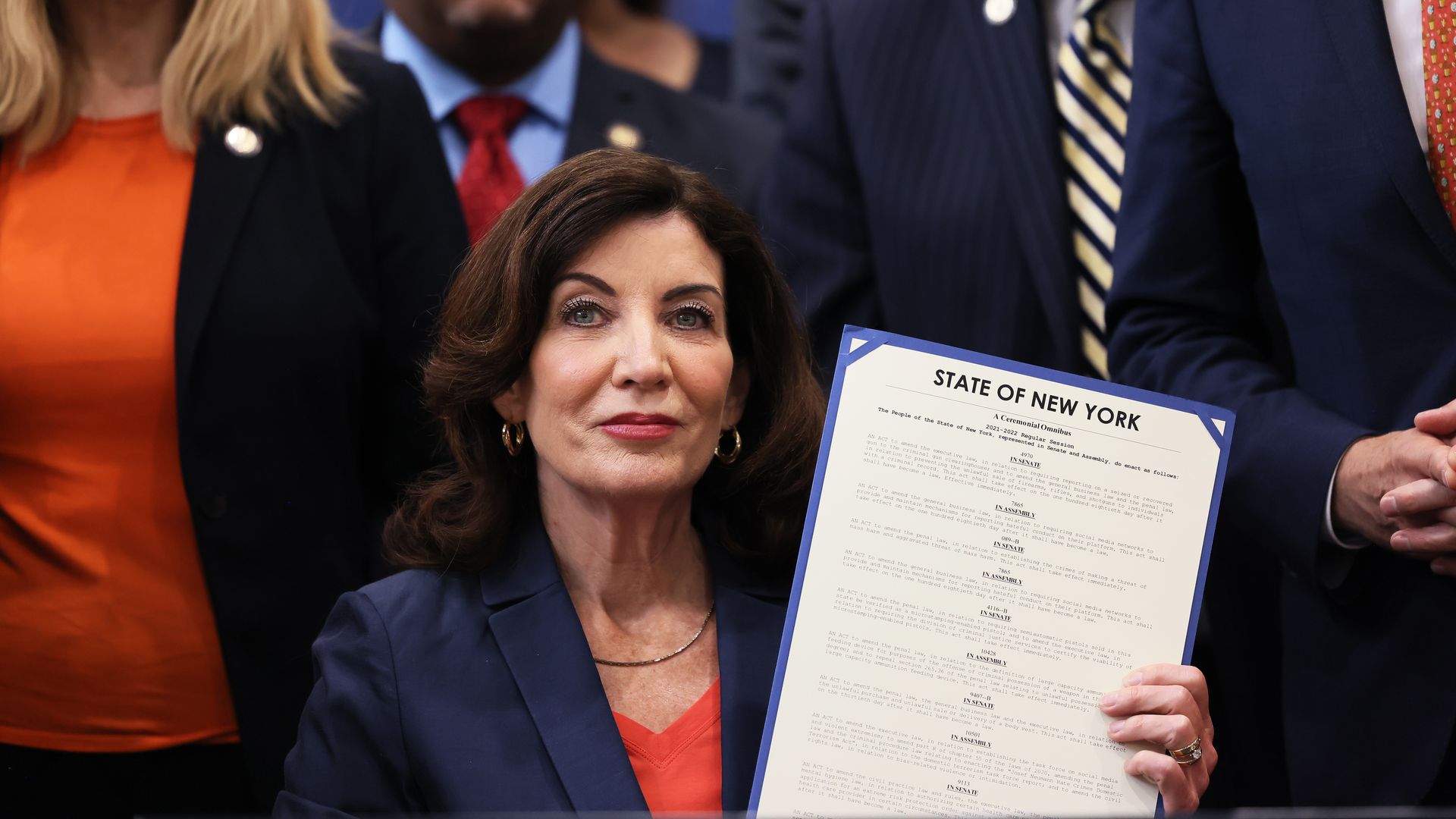Gov. Kathy Hochul holds up signed legislation as she is surrounded by lawmakers during a bill signing ceremony at the Northeast Bronx YMCA on June 06, 2022 in New York City. Photo by Michael M. Santiago/Getty Images