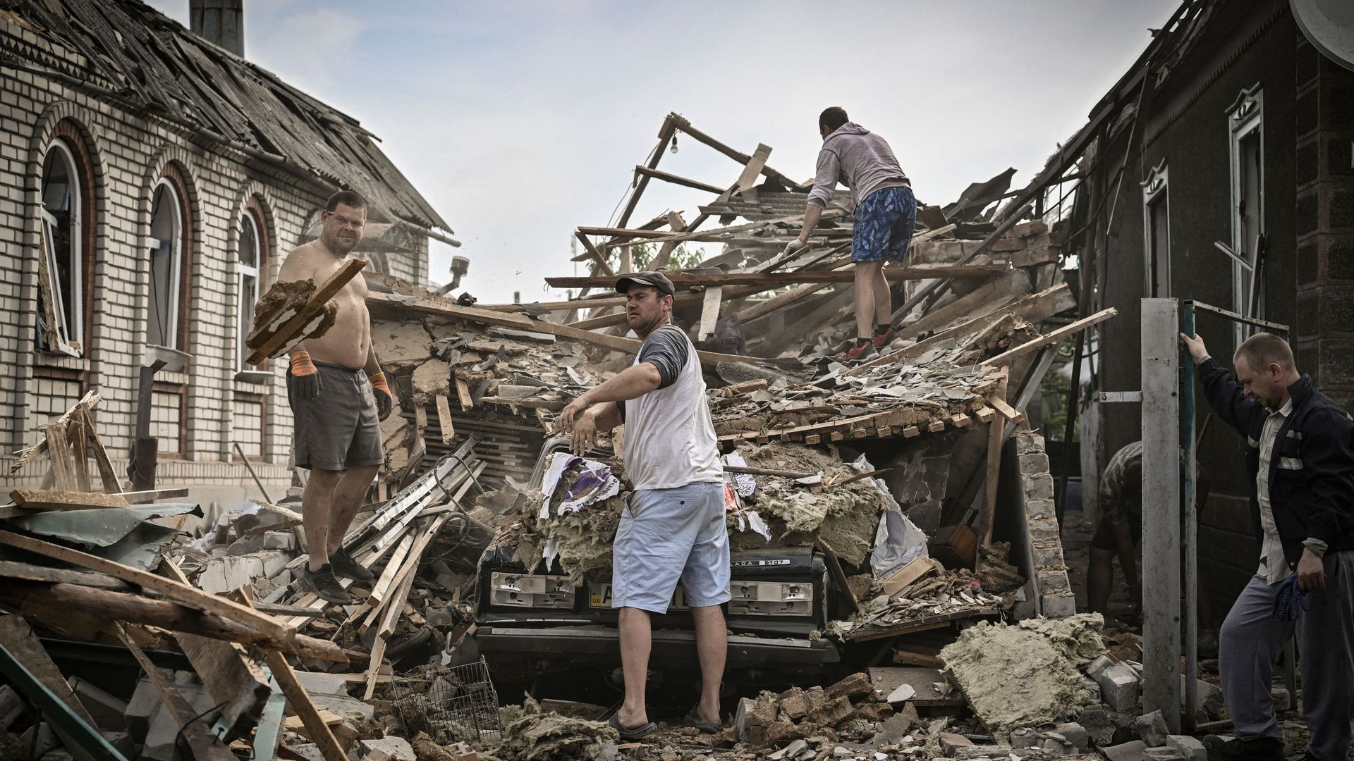People clean the debris from their destroyed house after a missile strike, which killed an old woman, in the city of Druzhkivka in the eastern Ukrainian region of Donbas on June 5, 2022. Photo: ARIS MESSINIS/AFP via Getty Images
