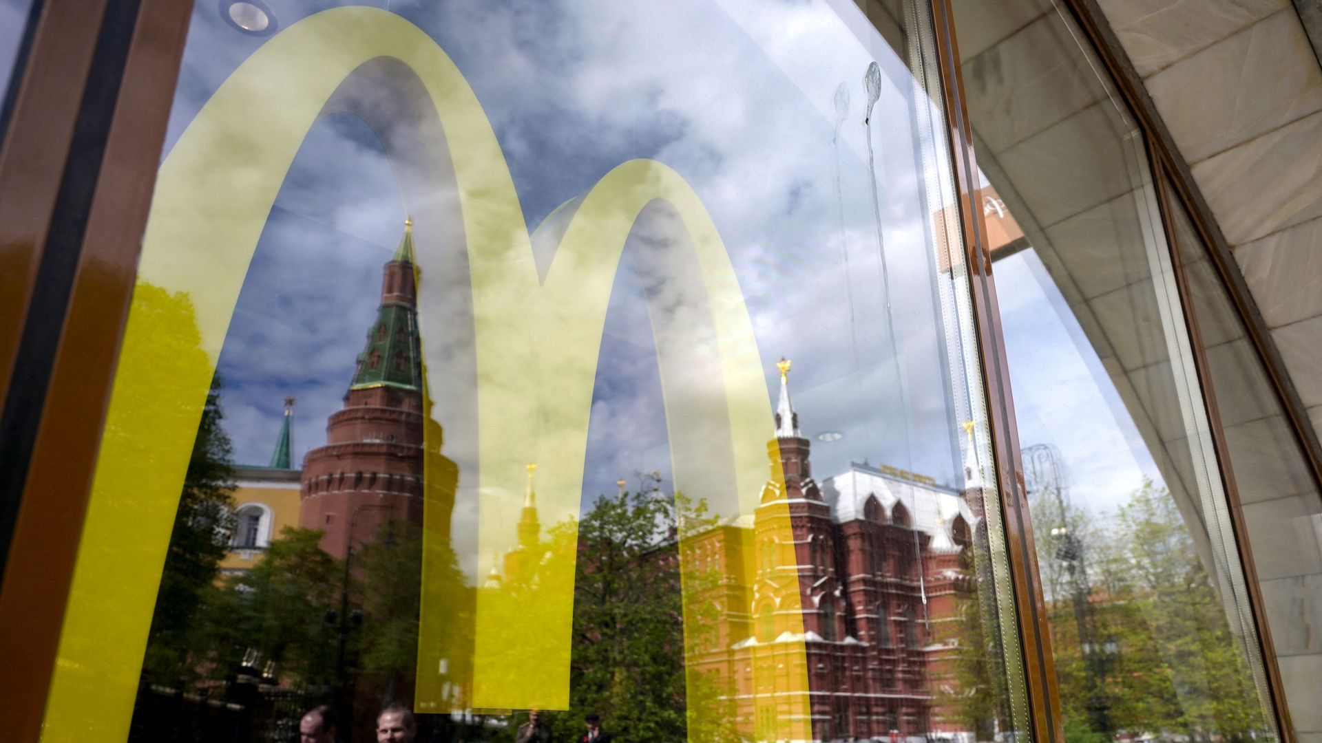 The Kremlin's towers and passers-by are seen reflected in the window of a closed McDonald's restaurant in Moscow on May 16, 2022. Photo by Natalia Kolesnikova/AFP via Getty Images