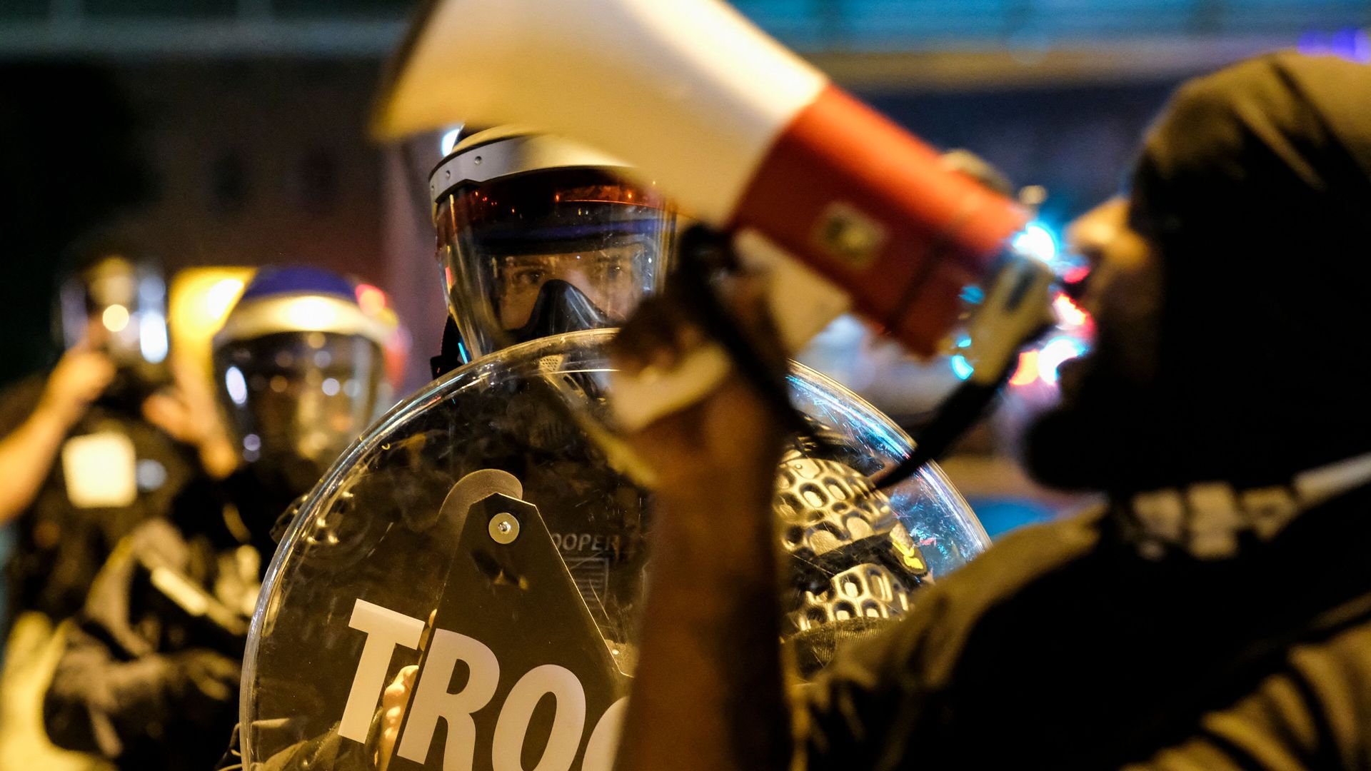 Troopers in riot gear watch as demonstrators gather outside Akron City Hall to protest the killing of Jayland Walker. Photo: Matthew Hatcher/AFP via Getty Images