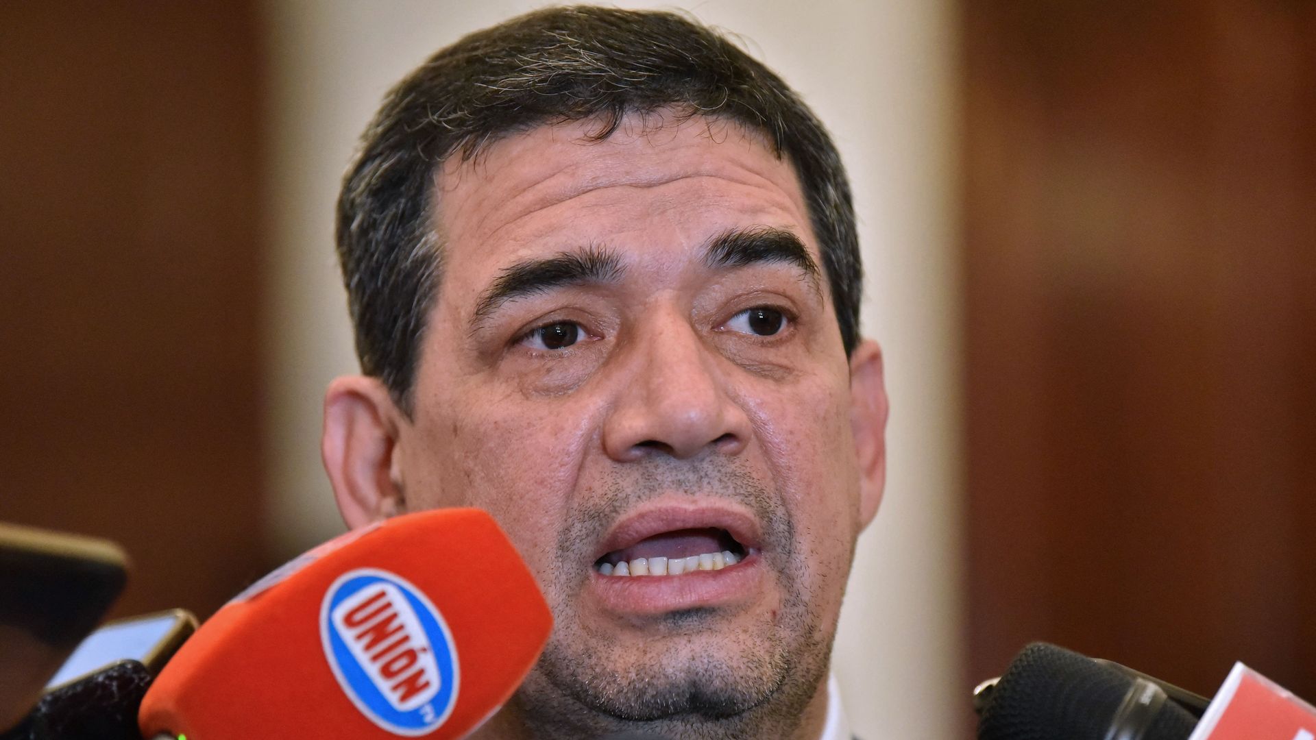 Paraguay's Vice President Hugo Velázquez, who last week said he would resign after being sanctioned by Washington for "significant corruption," speaks to the press to announce he had reconsidered and will remain in his post, in Asuncion on August 18, 2022. Photo: NORBERTO DUARTE/AFP via Getty Images