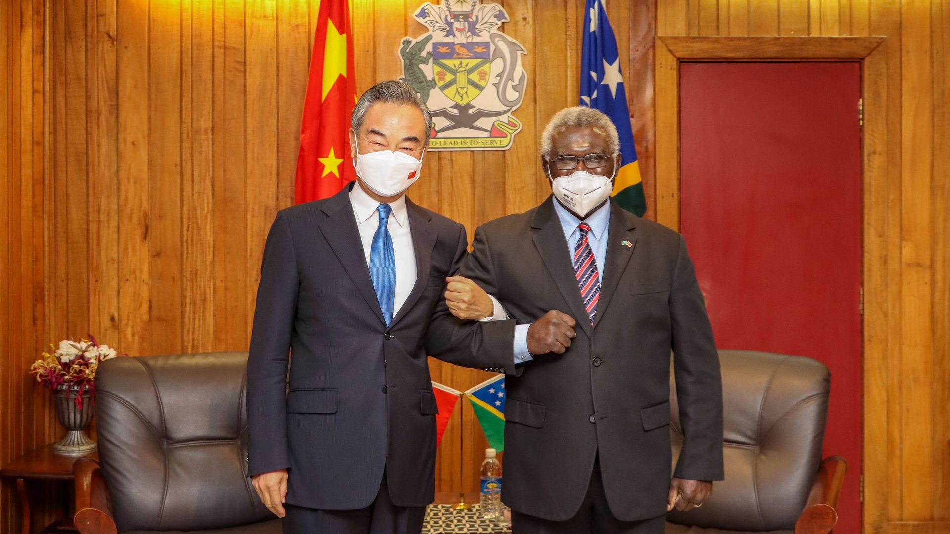 Solomon Islands Prime Minister Manasseh Sogavare (R) meets with visiting Chinese Foreign Minister Wang Yi in Honiara in May. Photo: Xinhua via Getty