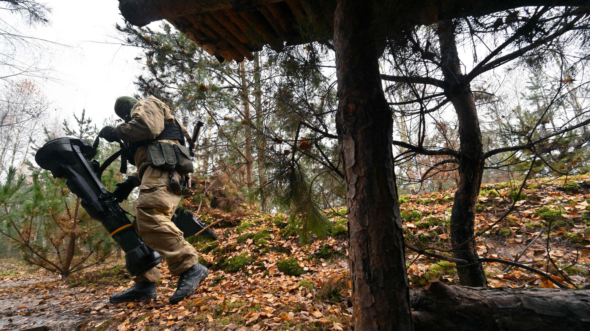 This Nov. 3, 2022, photo shows a Ukrainian border guard carrying a missile launcher near the Ukrainian border with Russia and Belarus. Photo: Sergei SUPINSKY/AFP via Getty Images