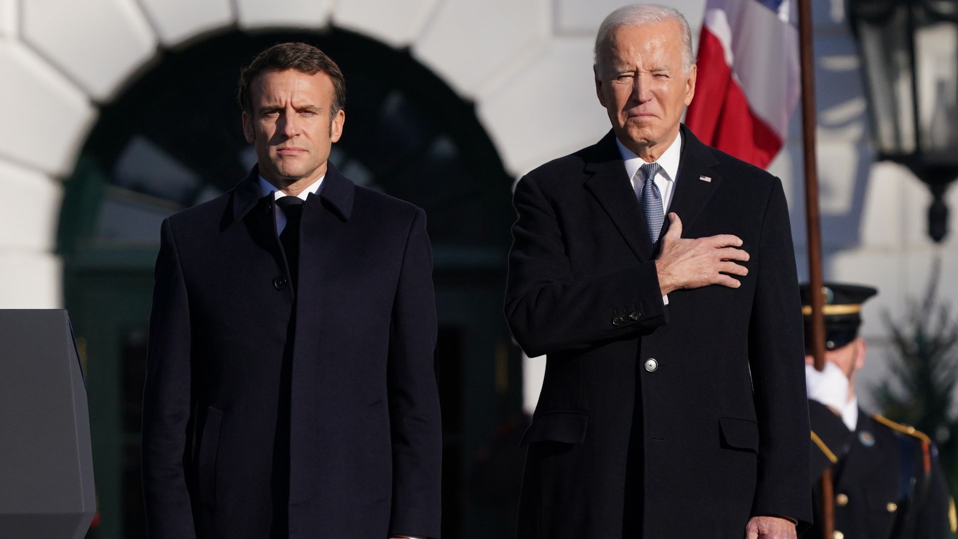 Presidents Macron and Biden today at the White House. Photo: Nathan Howard/Getty Images
