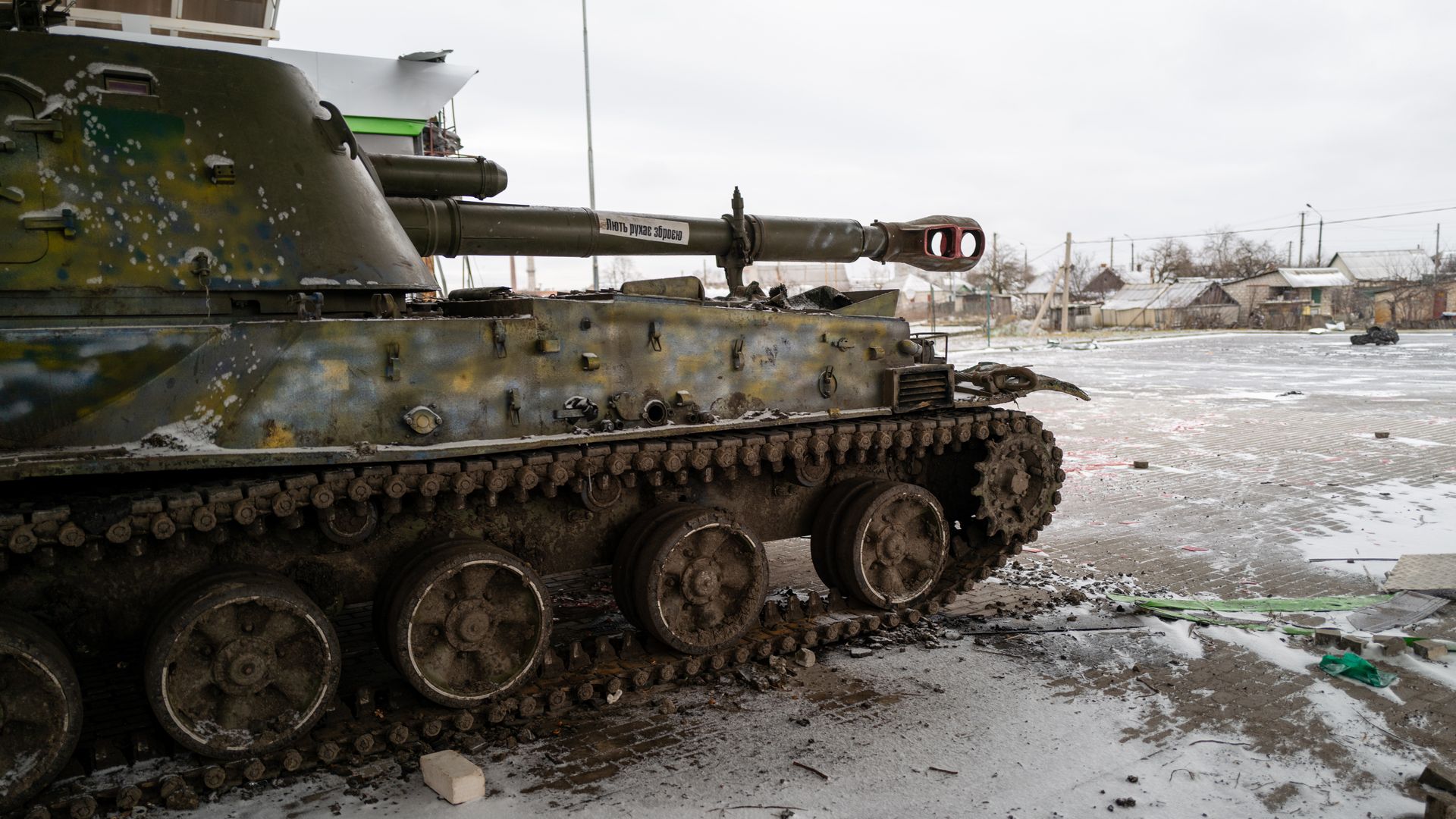 A Ukrainian tank sits along a street in the town of Kupiansk, which has experienced shelling from Russia ,on Jan. 6, 2023. Photo: Spencer Platt/Getty Images
