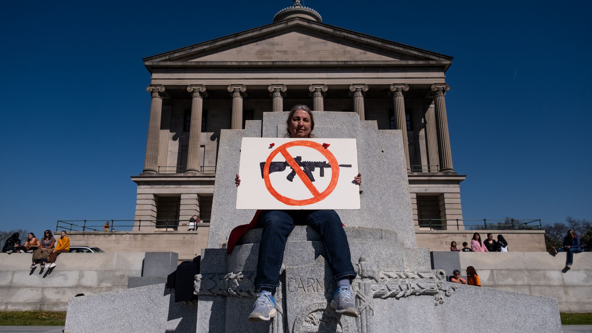 A protester sits with an anti-assault rifle sign near the Tennessee State Capitol last month. Photo: Seth Herald/Getty Images