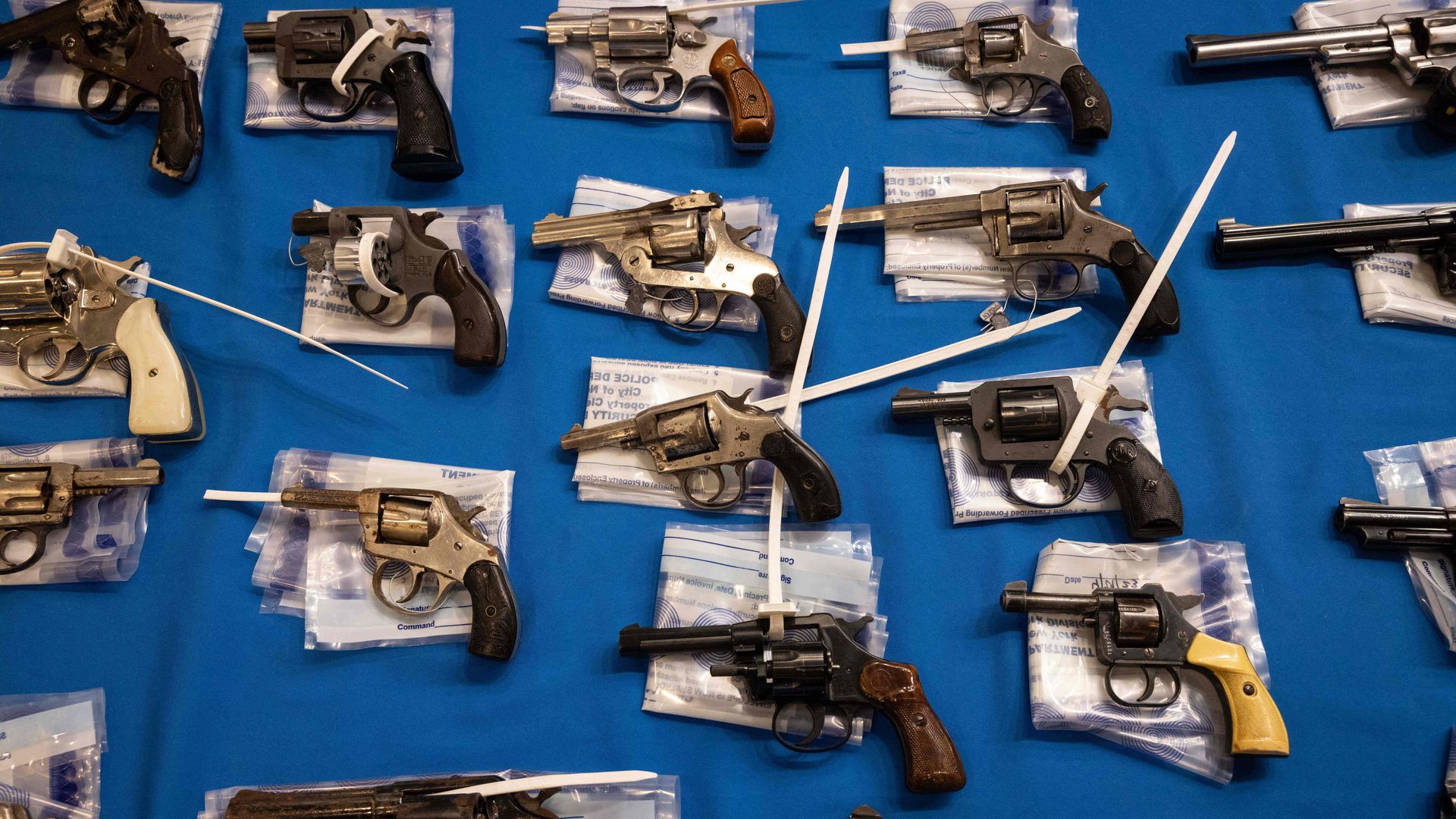 Handguns and firearms are displayed in New York on April 29. Photo: Yuki Iwamura/AFP via Getty Images