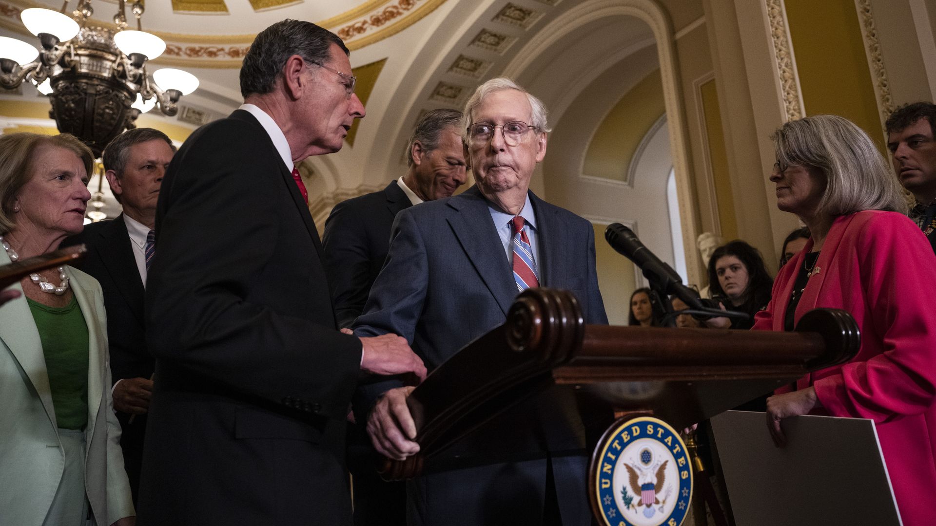 Sen. John Barrasso reaches out to help Senate Minority Leader Mitch McConnell during a news conference after a lunch meeting in Washington, DC. Photo: Drew Angerer/Getty Images