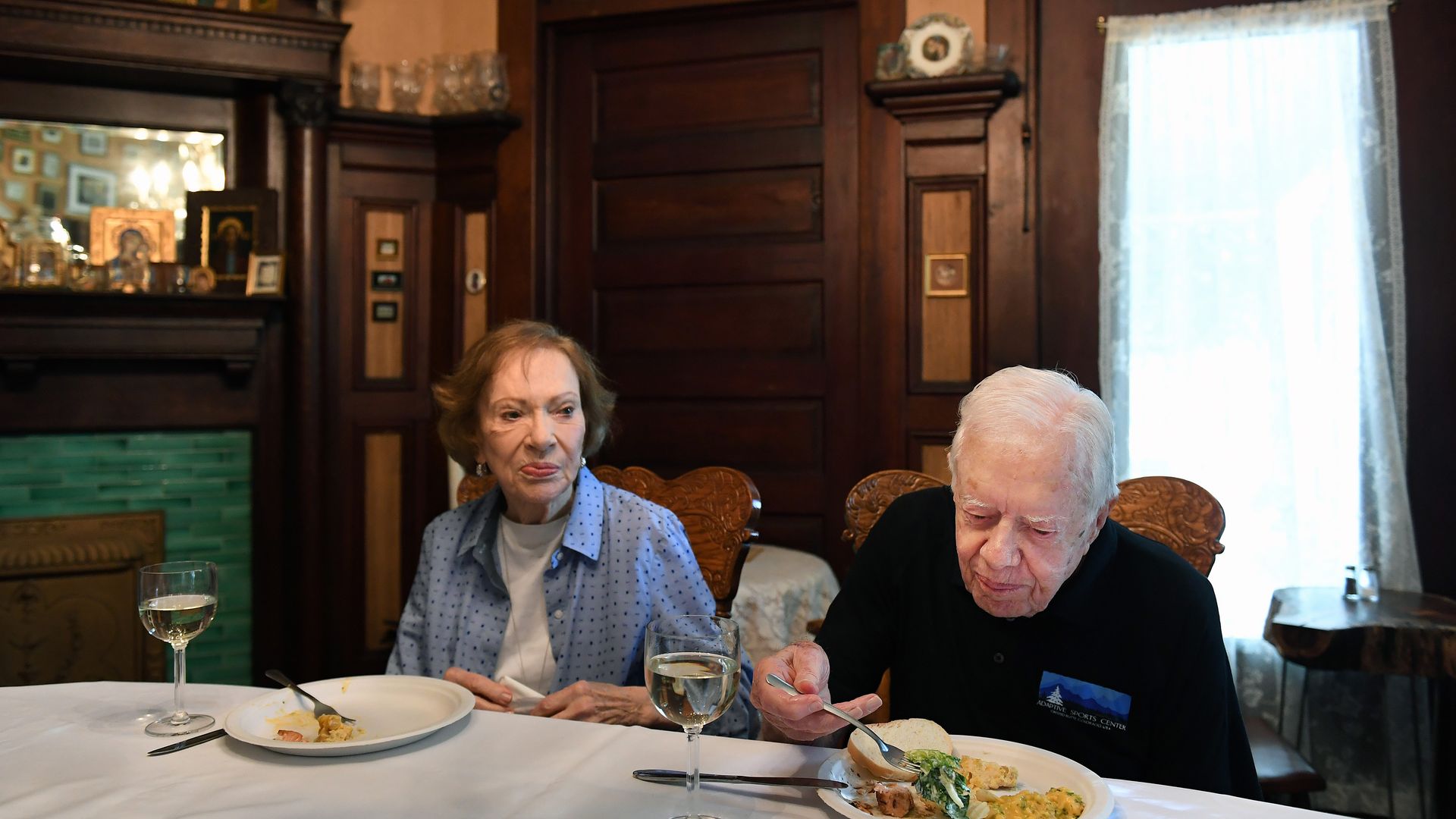 Former President Jimmy Carter and former First Lady Rosalynn Carter eat dinner while reporters interview them in 2018. Photo: Matt McClain/The Washington Post via Getty Images