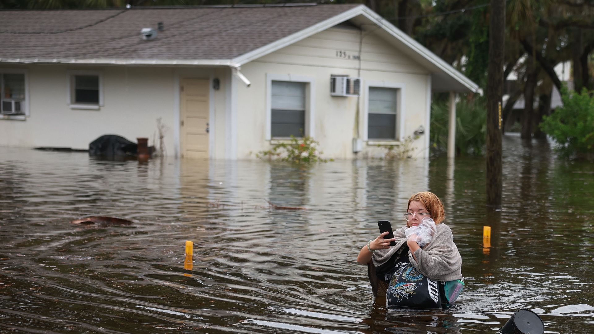 Makatla Ritchter wades through flood waters after having to evacuate her home when the flood waters from Hurricane Idalia inundated it on Aug. 30 in Tarpon Springs, Florida. Photo: Joe Raedle/Getty Images