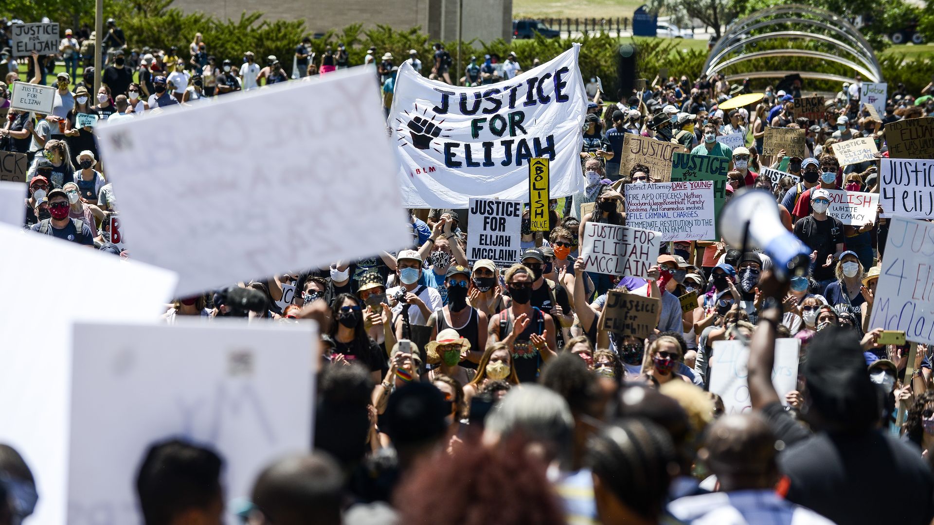 People rally outside the Aurora Police Department Headquarters to demand justice for Elijah McClain on June 27, 2020 in Aurora, Colorado. Photo: Michael Ciaglo/Getty Images