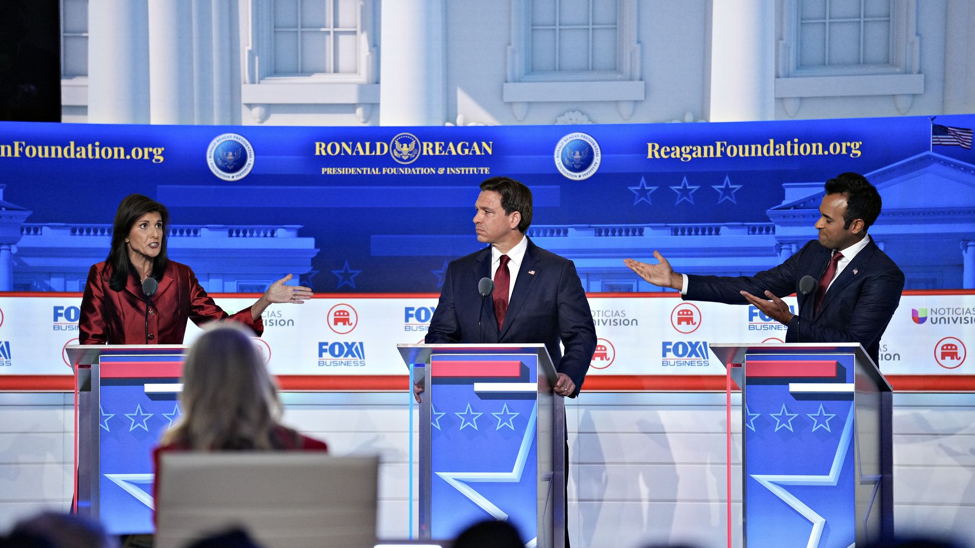 Nikki Haley, former ambassador to the United Nations and 2024 Republican presidential candidate, from left, Ron DeSantis, governor of Florida and 2024 Republican presidential candidate, and Vivek Ramaswamy, chairman and co-founder of Strive Asset Management and 2024 Republican presidential candidate on Wednesday, Sept. 27, 2023. Photographer: Eric Thayer/Bloomberg via Getty Images