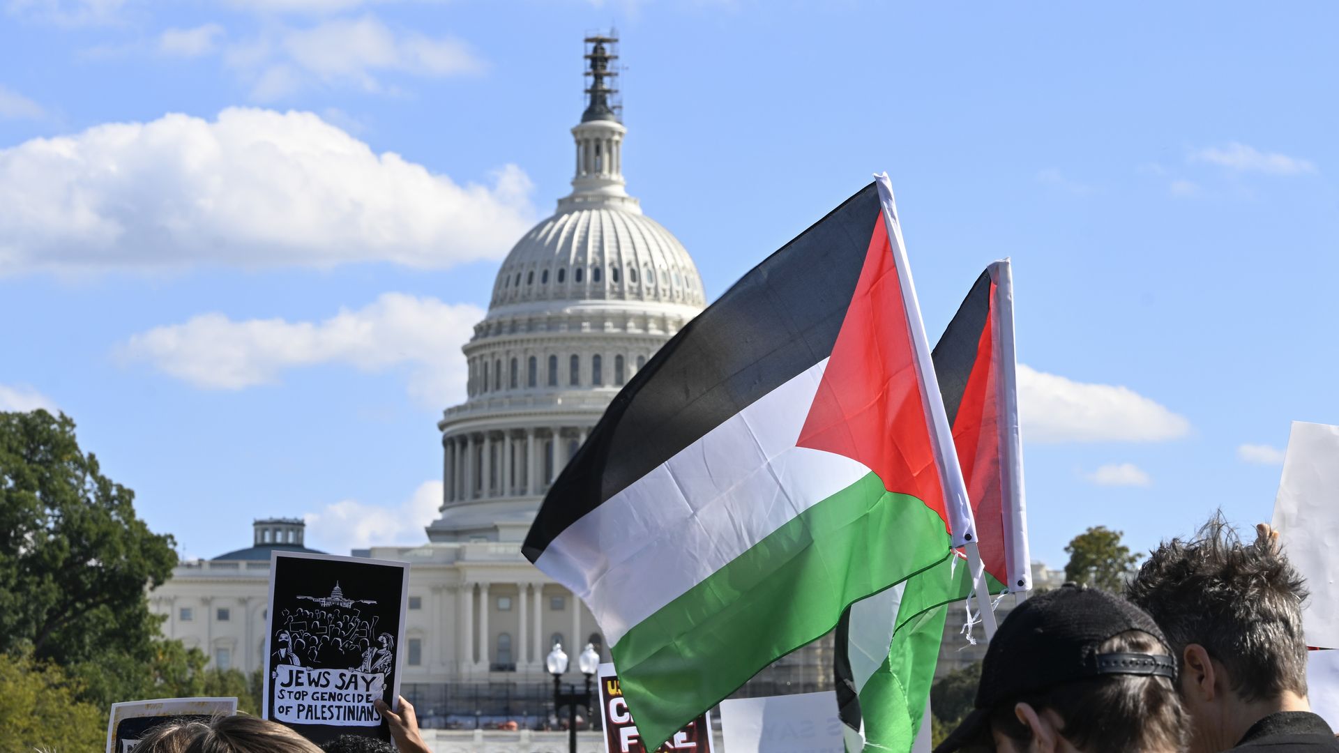 A group of people, demanding a ceasefire, hold banners as they gather to protest against the Israeli attacks on Gaza near the Capitol Building in Washington DC, United States on October 18, 2023. Photo: Celal Gunes/Anadolu via Getty Images.