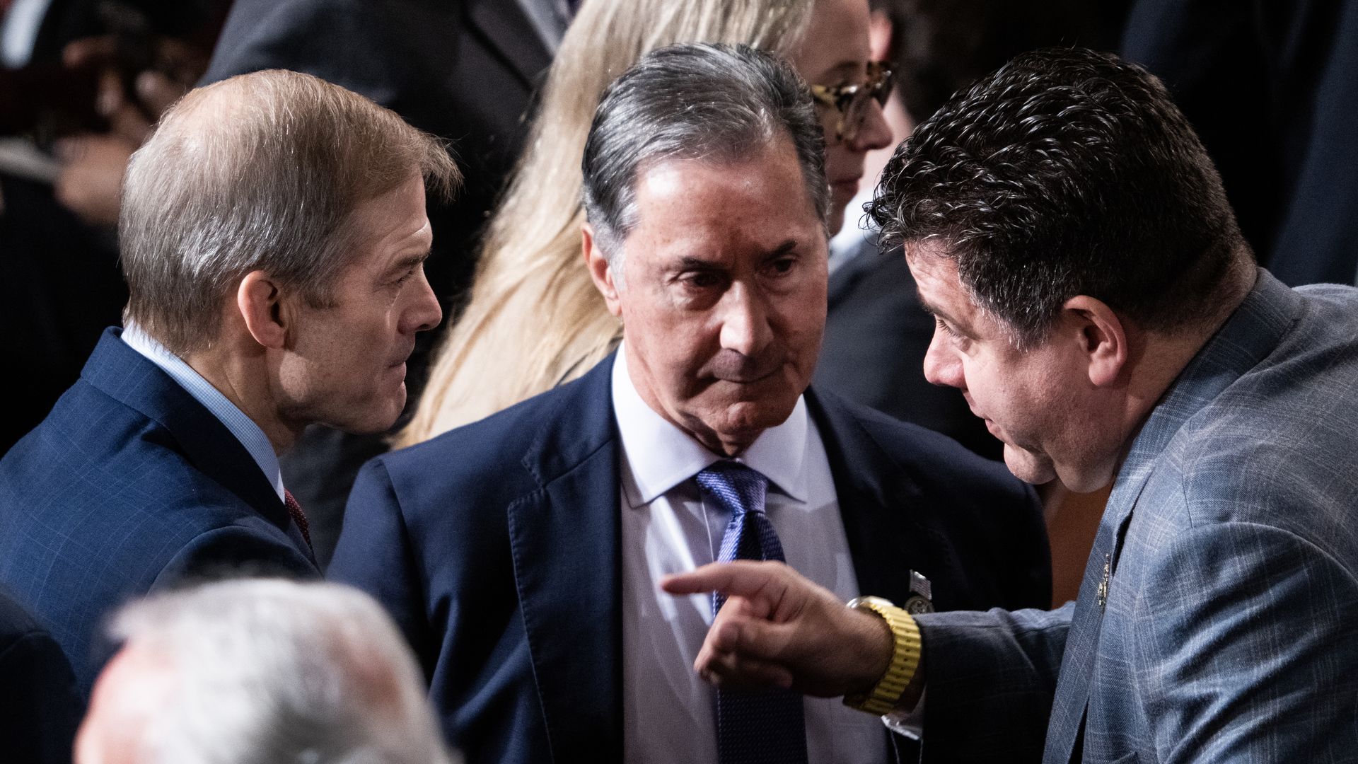 Rep. Gary Palmer (M) speaks to Reps. Jim Jordan (L) and Nick LaLota (R). Photo: Tom Williams/CQ-Roll Call, Inc via Getty Images.