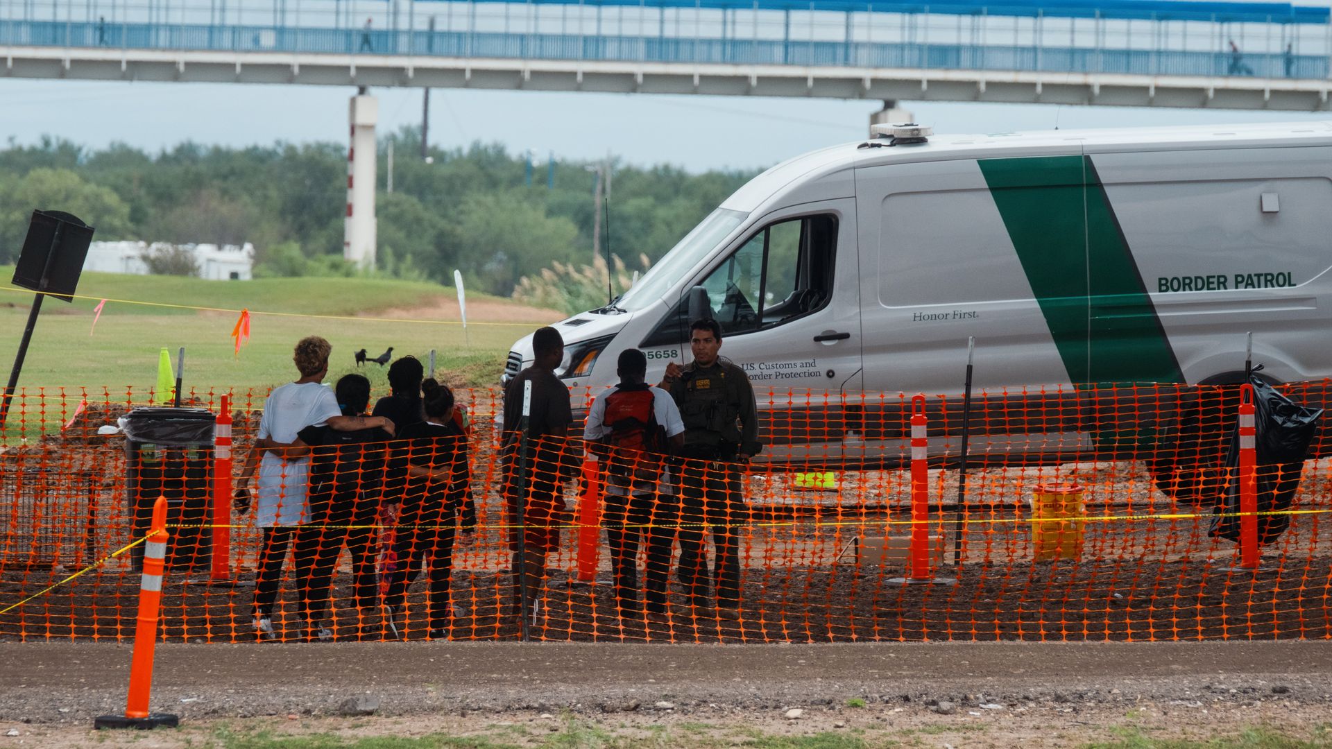 Migrants surrender to U.S. Border Patrol agents after crossing the Rio Grande River in Eagle Pass, Texas, on Oct. 12. Photo: Jordan Vonderhaar/Bloomberg via Getty Images