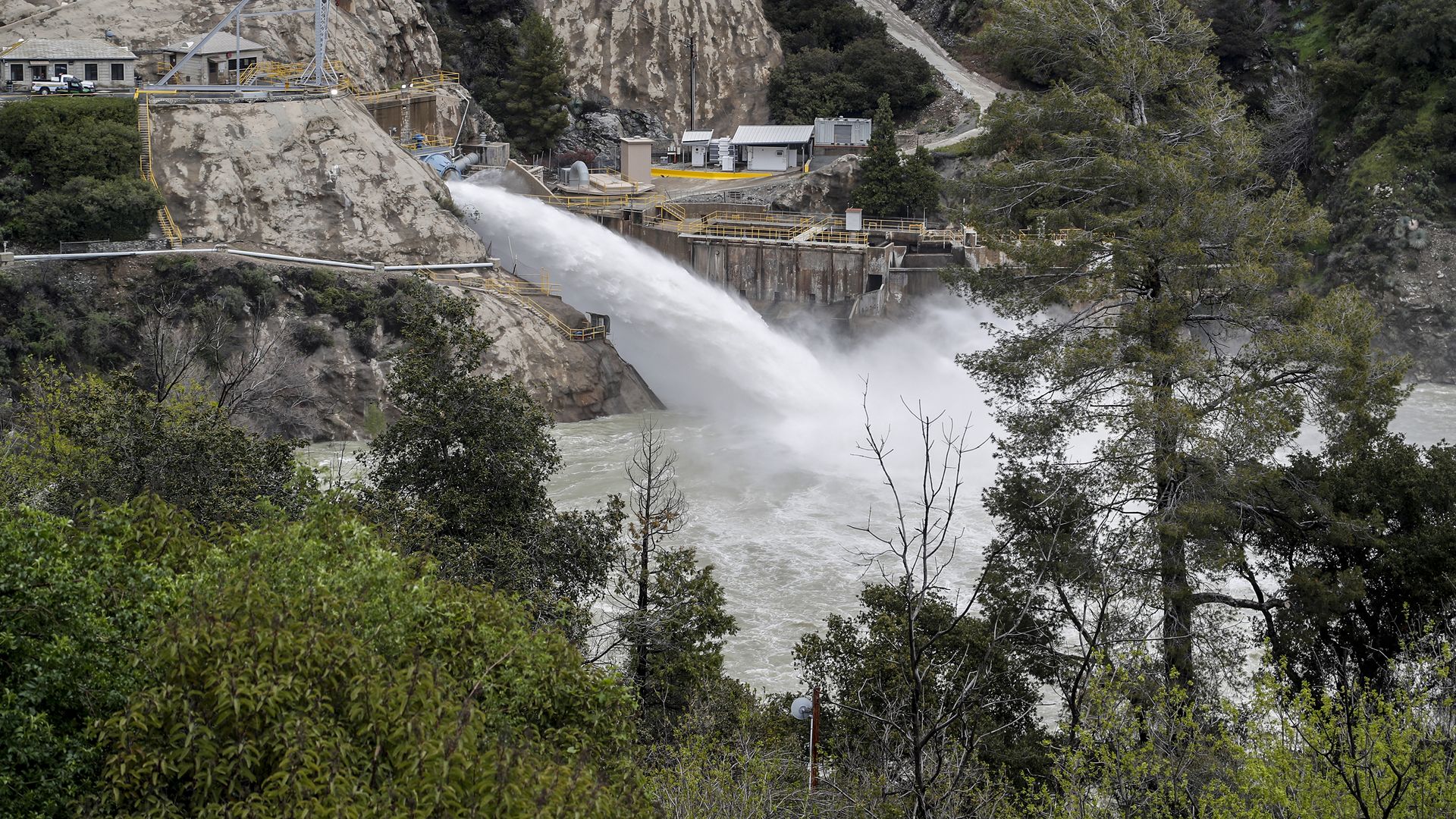 Water flows from the San Gabriel Dam as the San Gabriel River swells from heavy rainfall in March. Photo: Robert Gauthier/Los Angeles Times via Getty Images