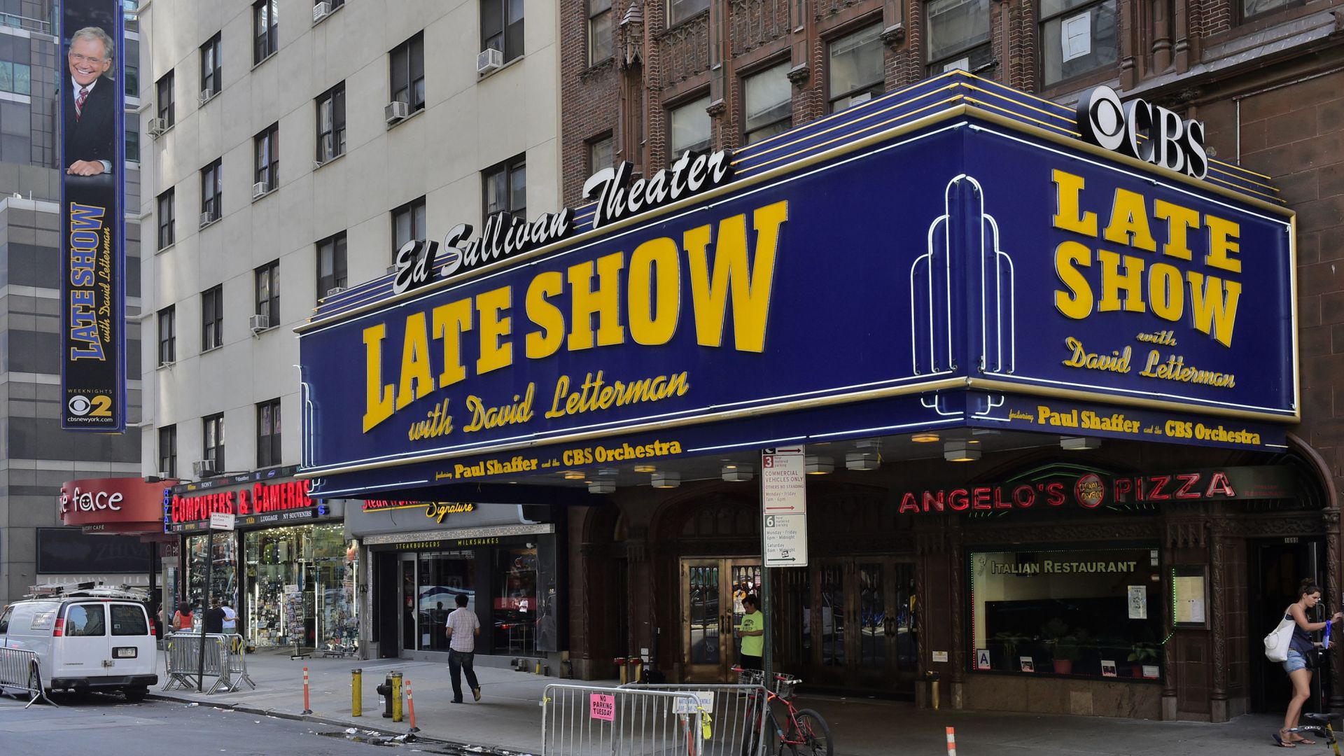 The marquee of the Ed Sullivan Theater in New York in 2015 before David Letterman passed the torch to Stephen Colbert. Photo: John Paul Filo/CBS via Getty Images