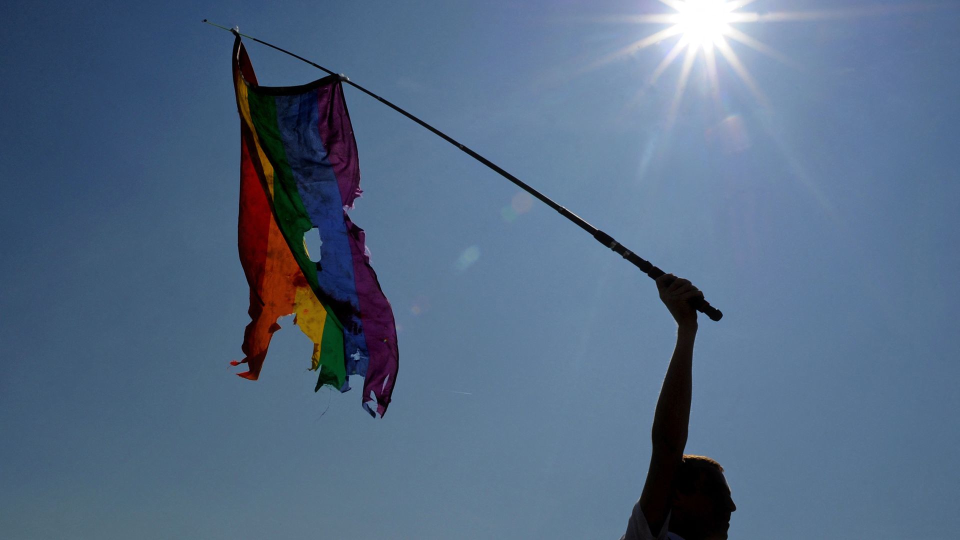 An activist waves a damaged rainbow flag during a gay pride in St. Petersburg in 2014. Photo: Olga Maltseva/Getty Images