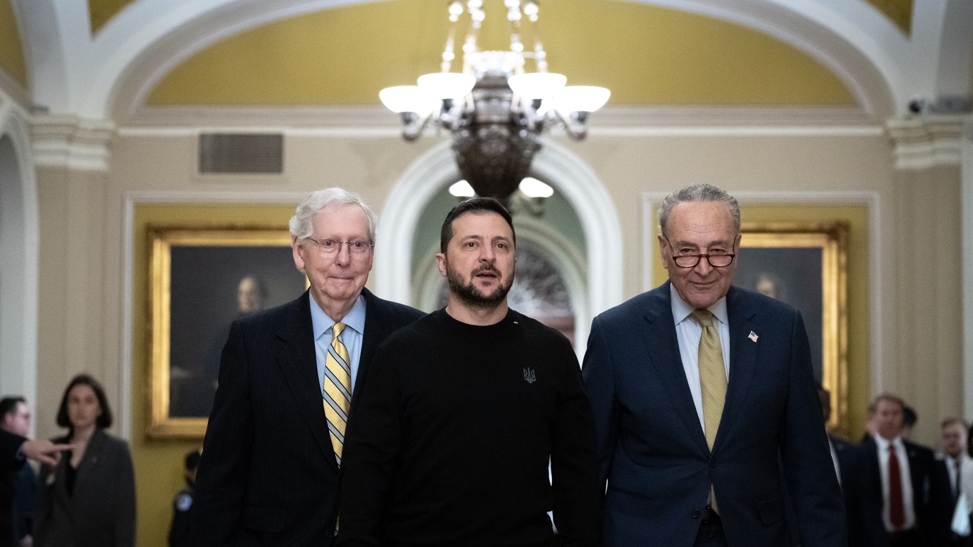 Senate Minority Leader Mitch McConnell, Ukrainian President Volodymyr Zelensky and Majority Leader Chuck Schumer. Photo: Drew Angerer/Getty Images.
