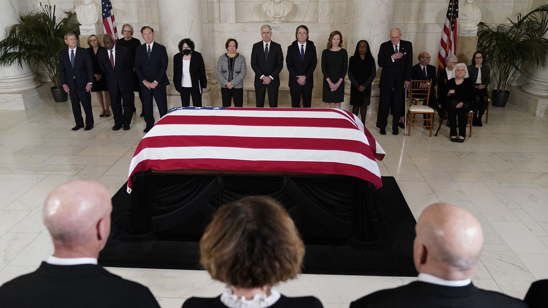 Family members and current or former Supreme Court justices stand before the flag-draped casket of retired Supreme Court Justice Sandra Day O'Connor on Dec. 18. (L-R) Chief Justice of the United States John Roberts, Justice Clarence Thomas, Justice Samuel Alito, Justice Sonia Sotomayor Justice Elena Kagan, Justice Neil Gorsuch, Justice Brett Kavanaugh, Justice Amy Coney Barrett, Justice Ketanji Brown Jackson and retired Justice Anthony Kennedy. Photo; Photo: Jacquelyn Martin/Getty Images