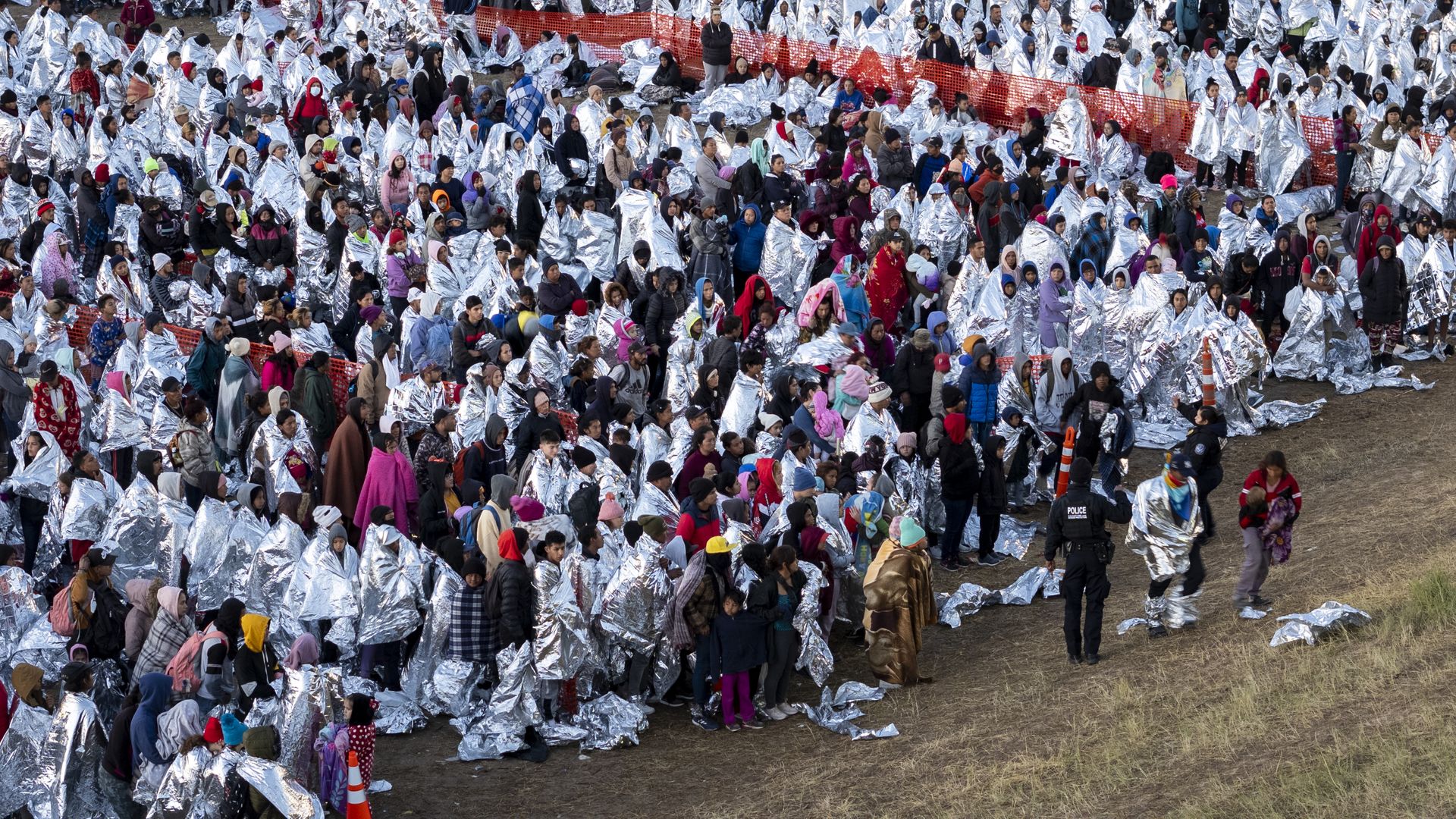 Thousands of immigrants, most wearing thermal blankets, await processing at a U.S. Border Patrol transit center Tuesday in Eagle Pass, Texas. Photo: John Moore/Getty Images