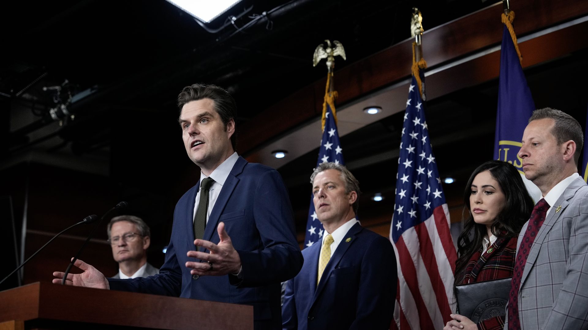 Rep. Matt Gaetz speaks during a news conference about unidentified aerial phenomena (UAP) transparency on Nov. 30, 2023 along with Reps. Tim Burchett, Andy Ogles, Anna Paulina Luna and Jared Moskowitz. Photo: Drew Angerer/Getty Images.
