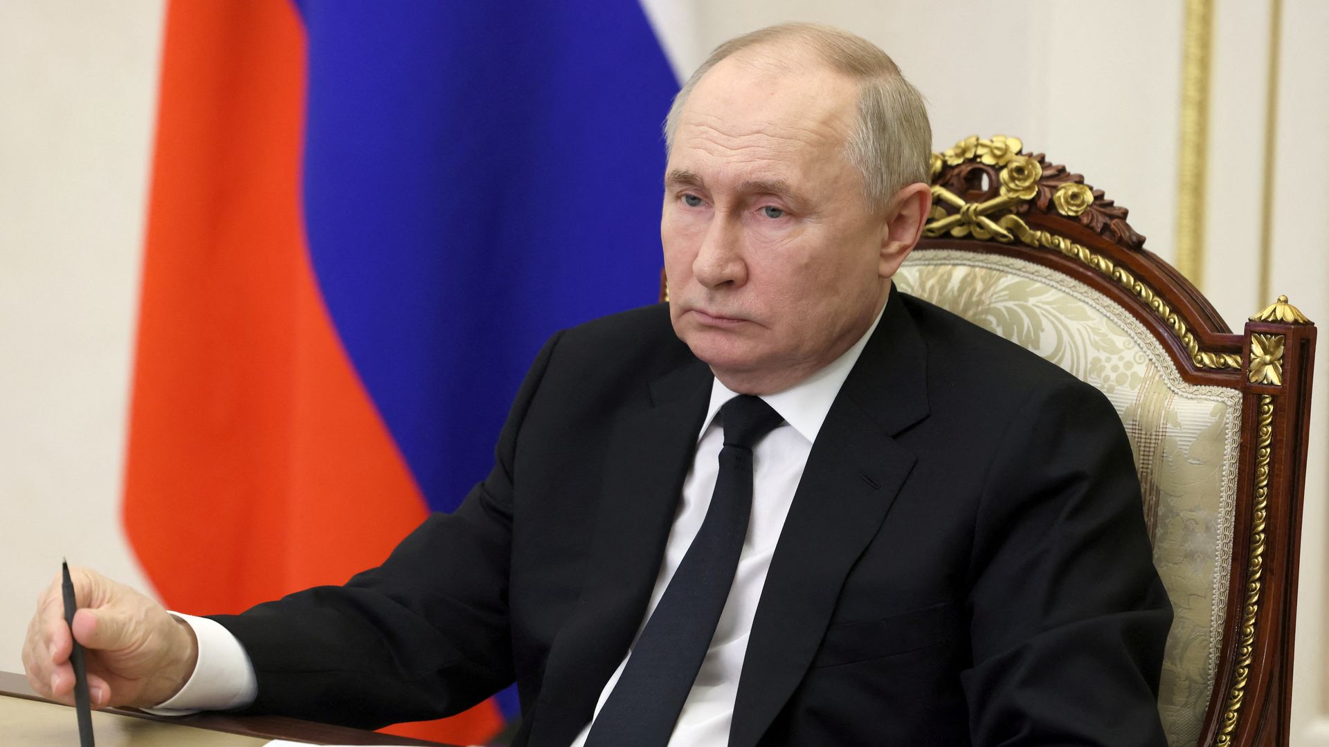 Russian leader Vladimir Putin holds a meeting at the Novo-Ogaryovo state residence, outside Moscow, Monday on the Crocus City Hall attack that killed more than 130 people. Photo: Mikhail Metzel/Poo/AFP via Getty Images