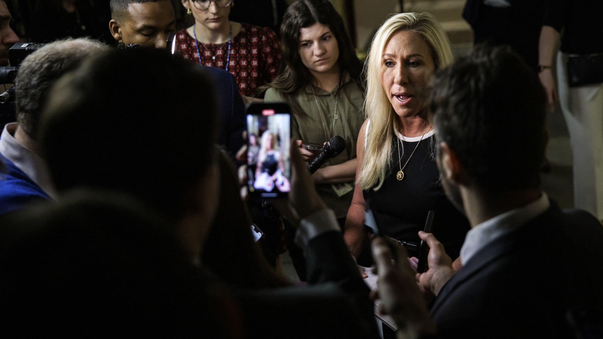 Why it matters: The Georgia Republican told reporters she warned Johnson that she is "watching what happens" on Ukraine funding and the reauthorization of FISA, a key spying law.