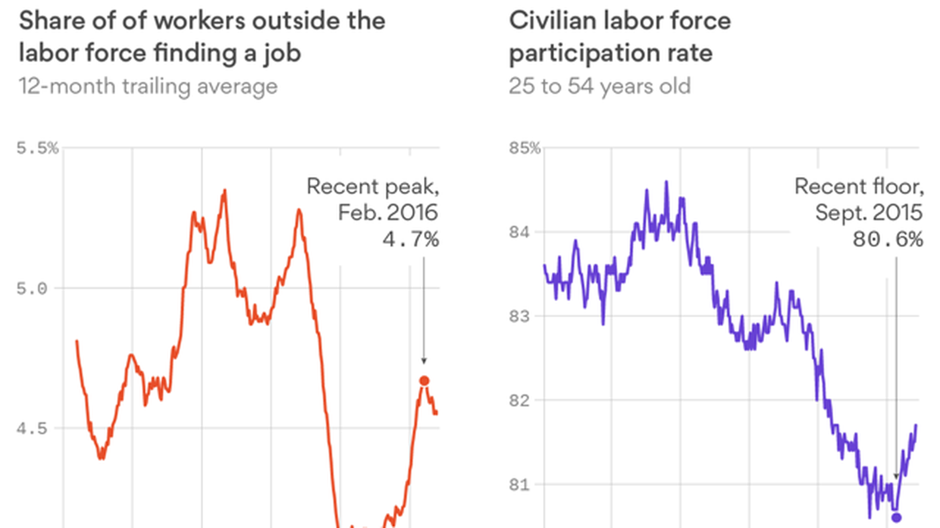 - Why this matters: Economists think severe recessions create a class of degraded workers for whom indefinite joblessness is a common fate. Raising interest rates now may create an economy that leaves those workers behind. The Fed has kept monetary policy loose, hoping that demand would grow high enough that employers would take a chance on these workers and even invest in training. A smaller share of those out of the labor force are finding jobs these days, however, even with the Fed's policy of easy money.
