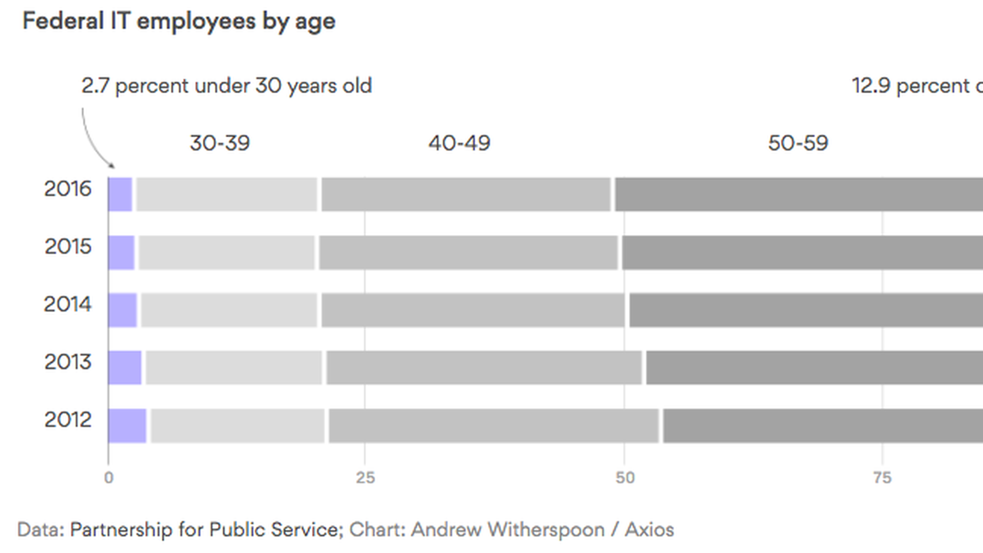 - The kicker: Federal IT employees over 60 outnumber those under 30 by nearly 5 to 1.