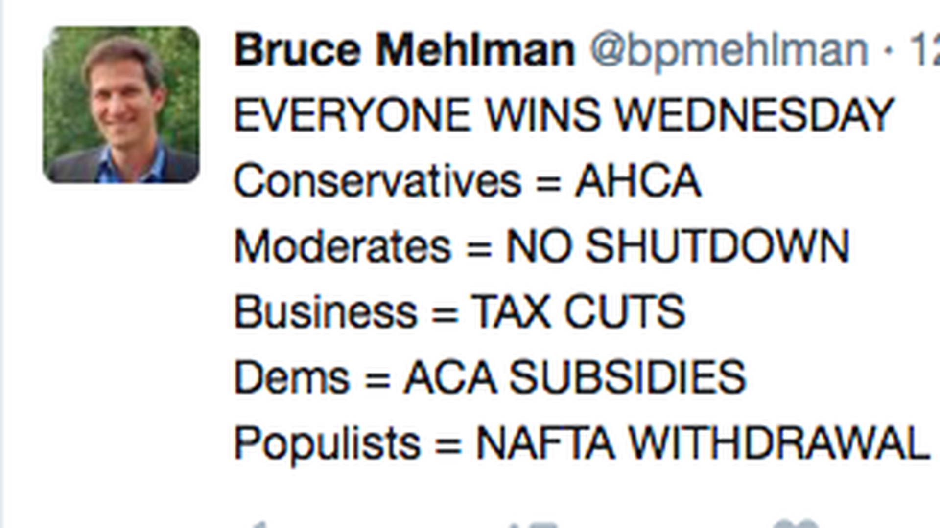 - He announces a tax "plan" that's one page, so he has plenty of room to negotiate details with the Hill, and give lots of wins.