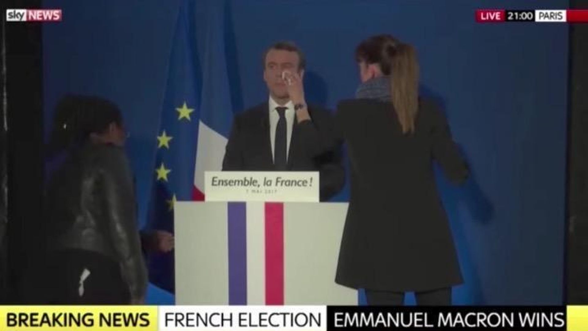 Before his victory speech last night, French President-elect Emmanuel Macron got his makeup done in front of news cameras.