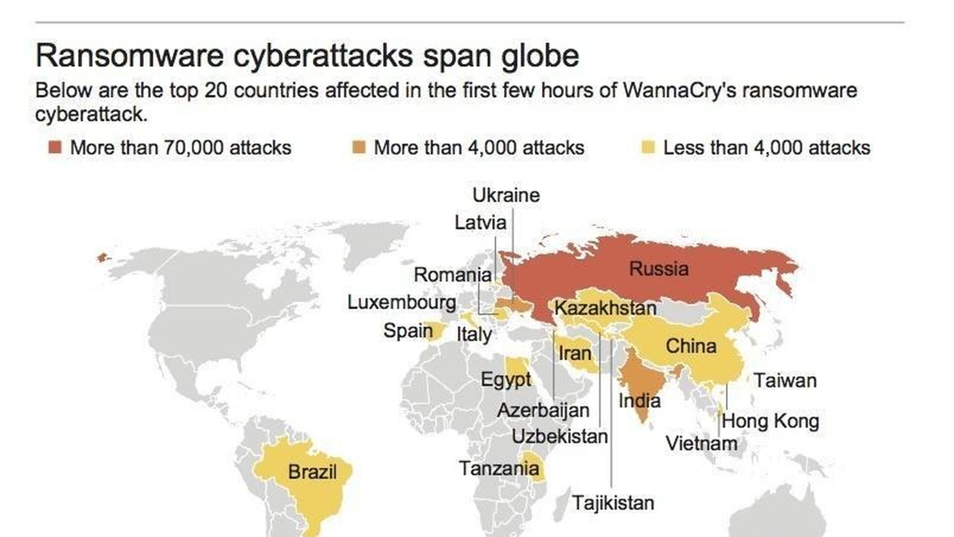 - "More than 75,000 computers in 99 countries were compromised, ... with a heavy concentration of infections in Russia and Ukraine."