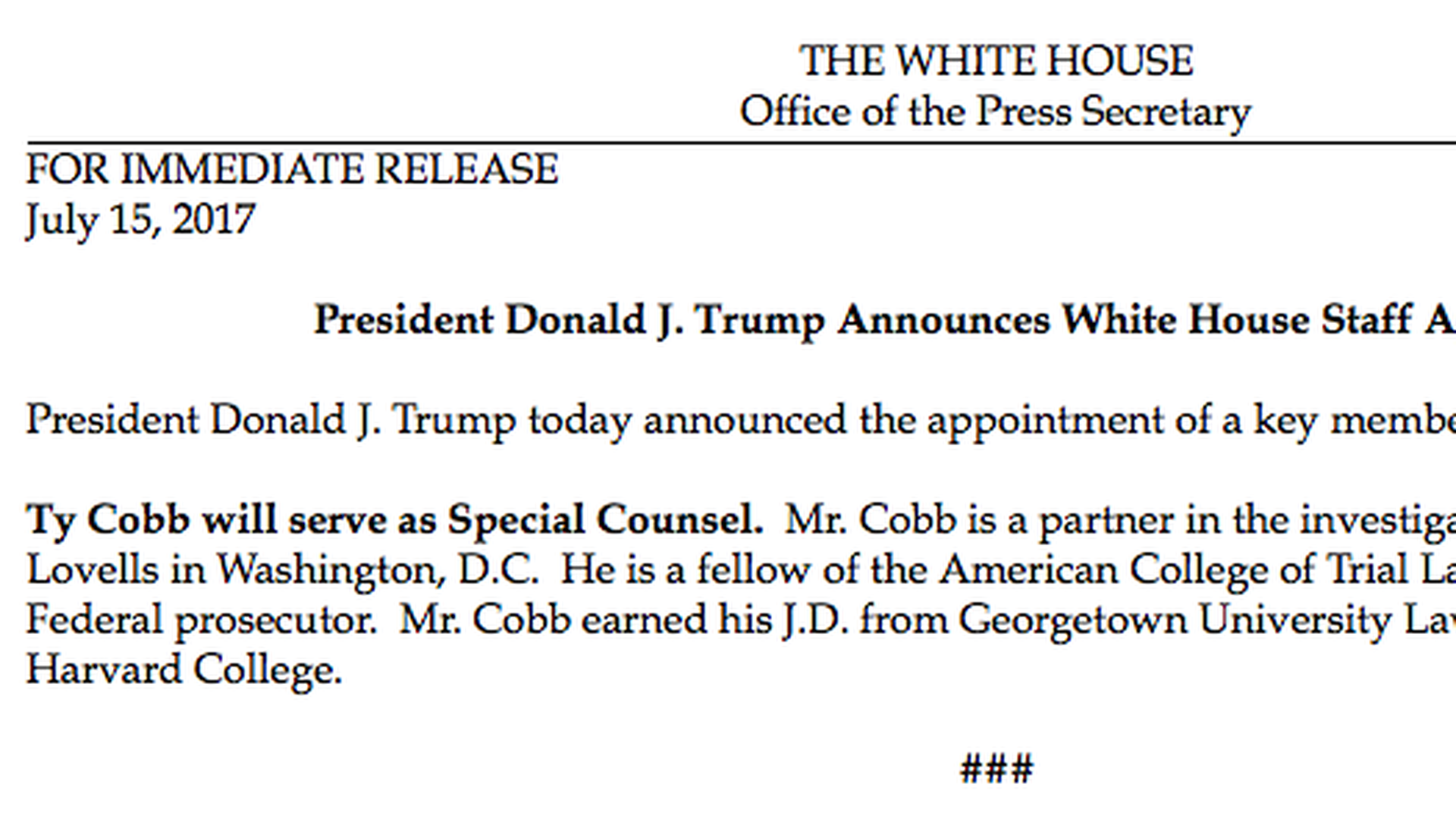 From his Hogan Lovells law-firm bio: "Bet-the-company litigation calls for a unique combination of skills, experience, and track record. Ty Cobb ... has been widely recognized as one of the premier white collar, Securities and Exchange Commission (SEC) enforcement, and congressional investigations lawyers in the world.