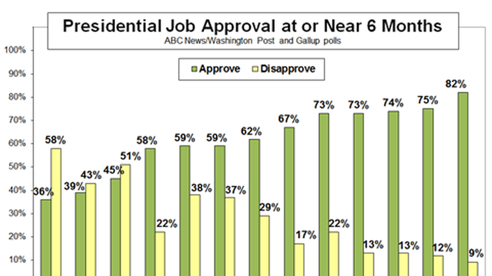 An ABC News/Washington Post poll gives Trump the lowest six-month (coming up Thursday!) approval rating of any president in polls dating back 70 years. He has 36% approval, down 6 points from his 100-day mark, itself a low. The previous six-month low was Gerald Ford, at 39% in February 1975.