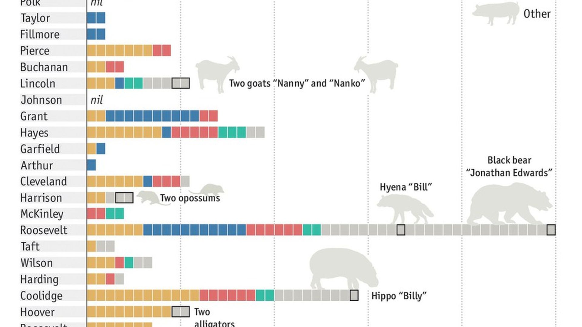 Per The Economist: "The last pet-less leader in American history was Andrew Johnson, who left office in 1869 and is best-known for being one of only two presidents to be impeached (the other, Bill Clinton, had a dog and a cat). According to the Presidential Pet Museum, the White House has been home to over 300 animals, ranging from dozens of dogs, horses and birds to the occasional bear, tiger and alligator."