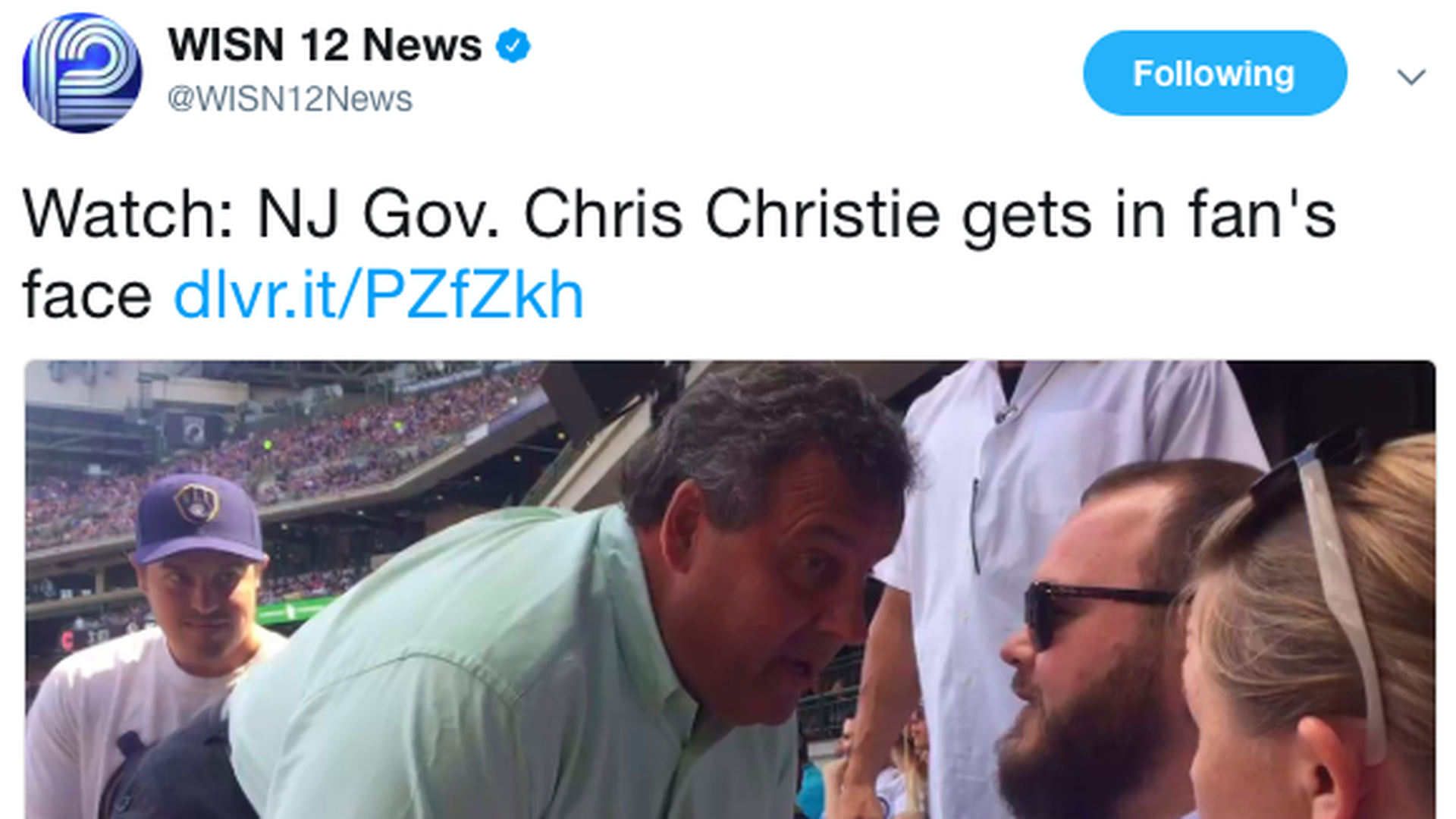 In Milwaukee yesterday, a nacho-toting Gov. Chris Christie paused at the game between the Brewers and the Chicago Cubs to get in a fan's face and call him a "big shot," according to WISN Channel 12.