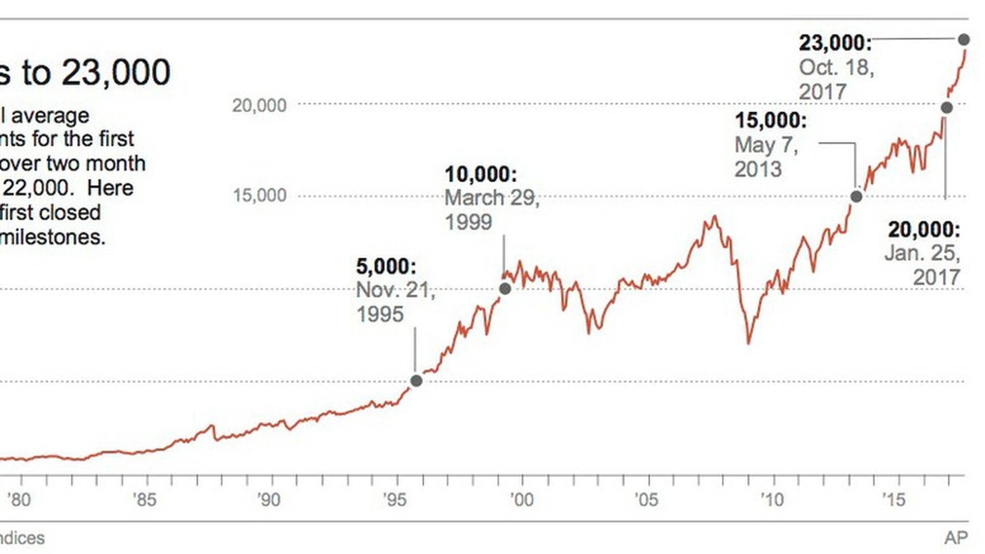 - The Trump bump: "The S&P 500 hasn't suffered a daily pullback of 3% or more since Nov. 4, the longest stretch without a decline of that magnitude since the mid-1990s. So far this year the Dow has surged 17%, compared with the S&P 500's 14% rise."