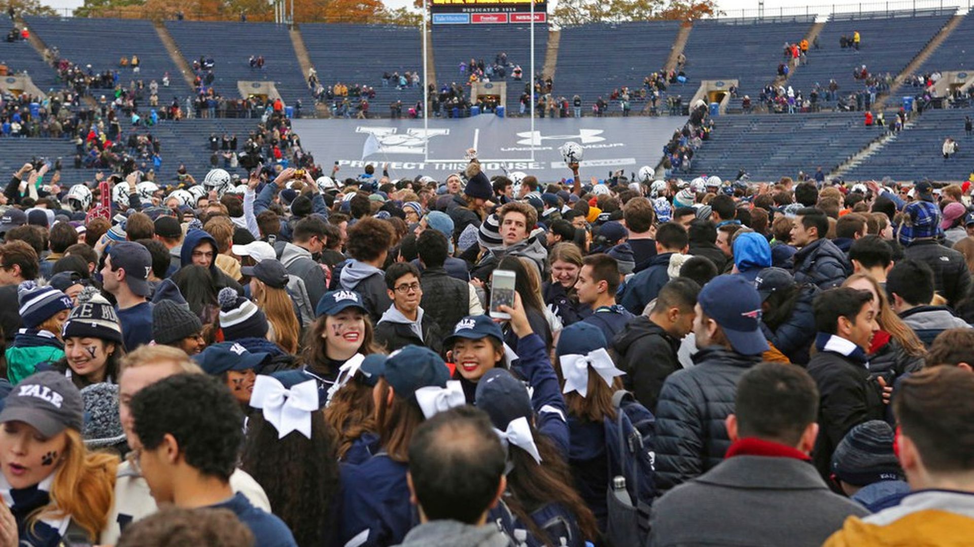Yale students rush the field after beating Harvard in The Game. Yale's 24-3 win secured the Bulldogs' first outright Ivy League championship in 37 years (1980).