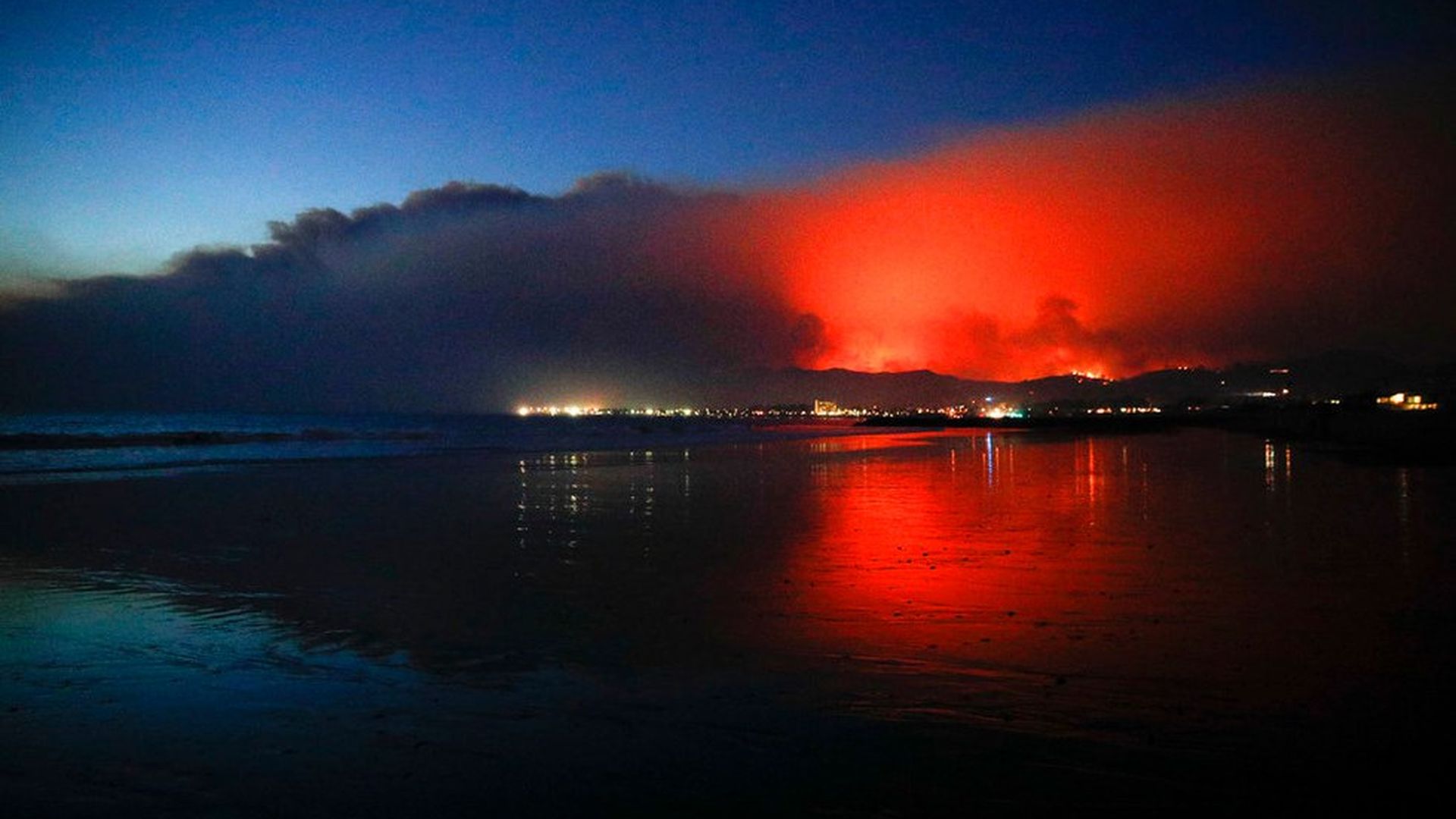 The red glow of a wildfire is reflected on the beach in Ventura, Calif., yesterday.