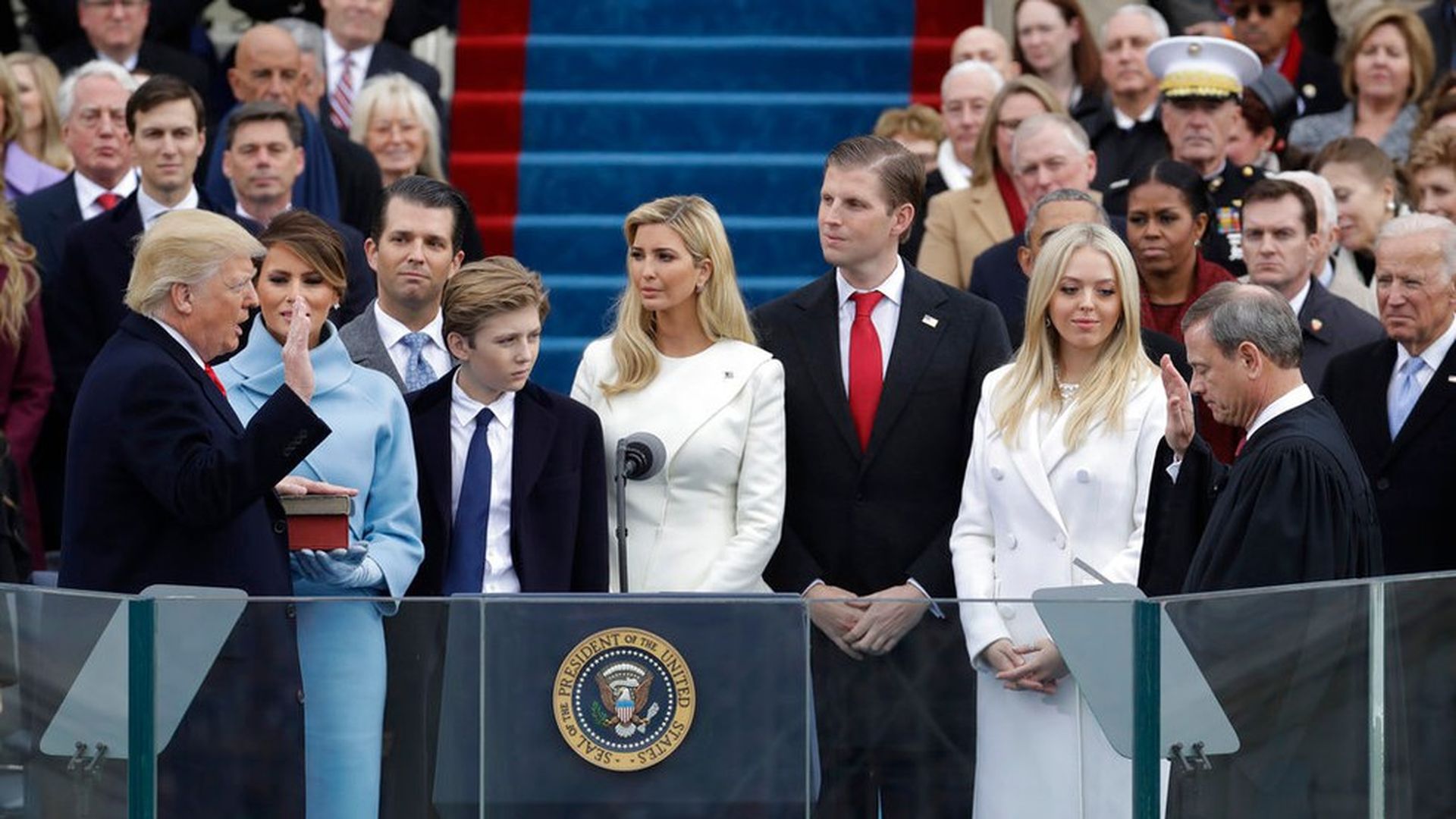 It begins ... Donald John Trump is sworn in as the 45th president of the United States by Chief Justice John Roberts, as Melania Trump and his family looks on at the U.S. Capitol on Jan. 20.