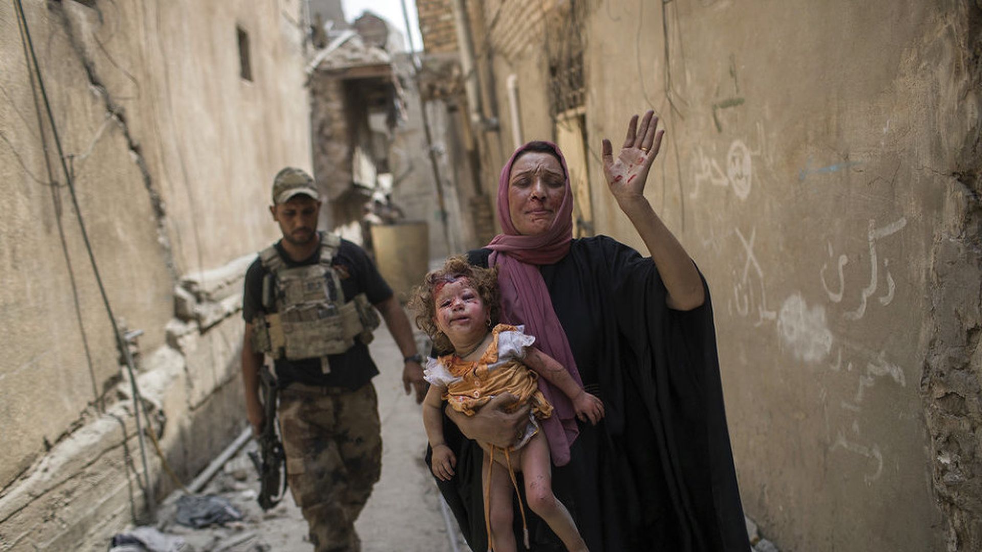 Reliving 2017 in 30 images ... ISIS loses its caliphate: A woman holds an injured girl as Iraqi forces advance against Islamic State group militants in the old city of Mosul, Iraq, on July 3.