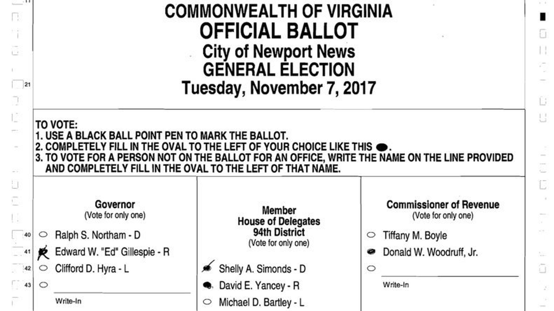 - "Control of Virginia's legislature hung in limbo ... after a three-judge panel declined to certify the recount of a key House [of Delegates] race, saying that a questionable ballot should be counted in favor of the Republican and tying a race that Democrats thought they had won by a single vote."