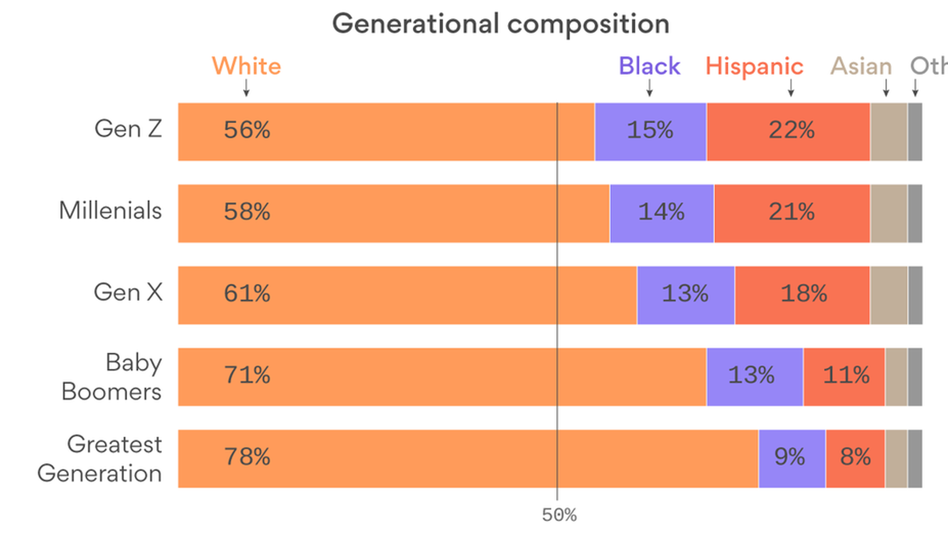 - Generation Z is the most diverse TV generation, boasting the largest percentage of Hispanics and Blacks of all generations at 22% and 15% respectively. By comparison, the Greatest Generation (71 years-old+), is 8% Hispanic and 9% non-Hispanic Black.